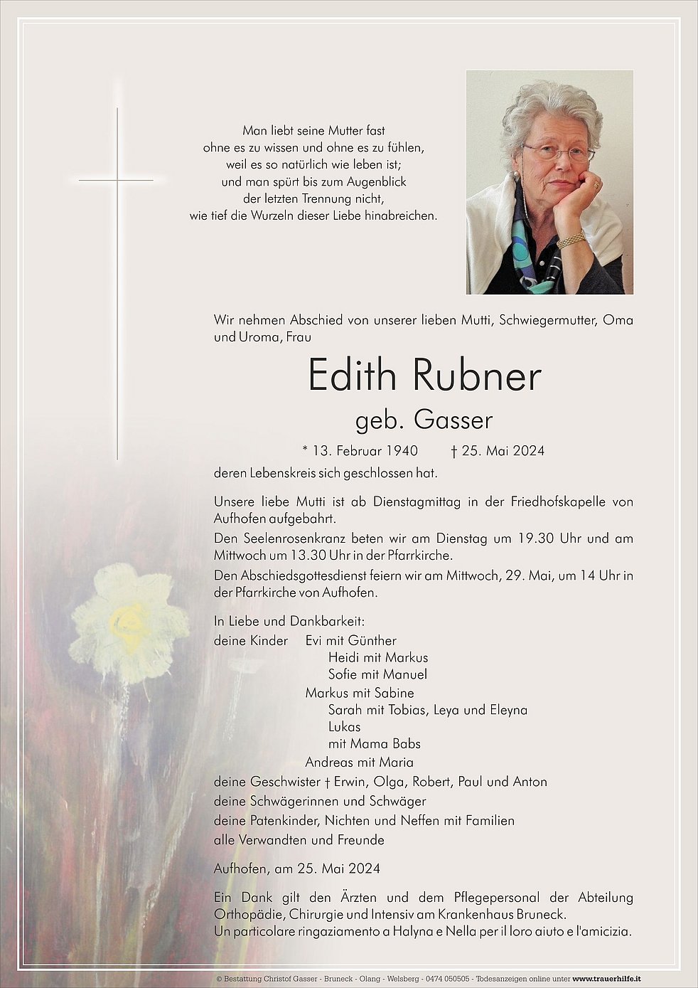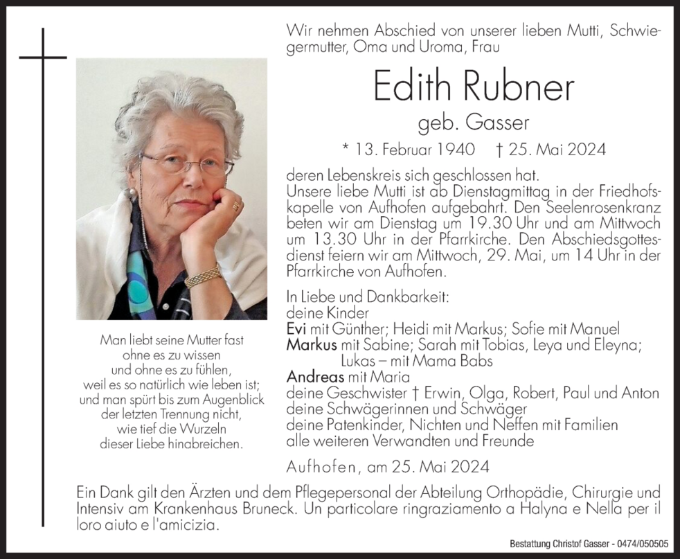 Unsere liebe Mutti ist ab Dienstagmittag in der Friedhofskapelle von Aufhofen aufgebahrt.