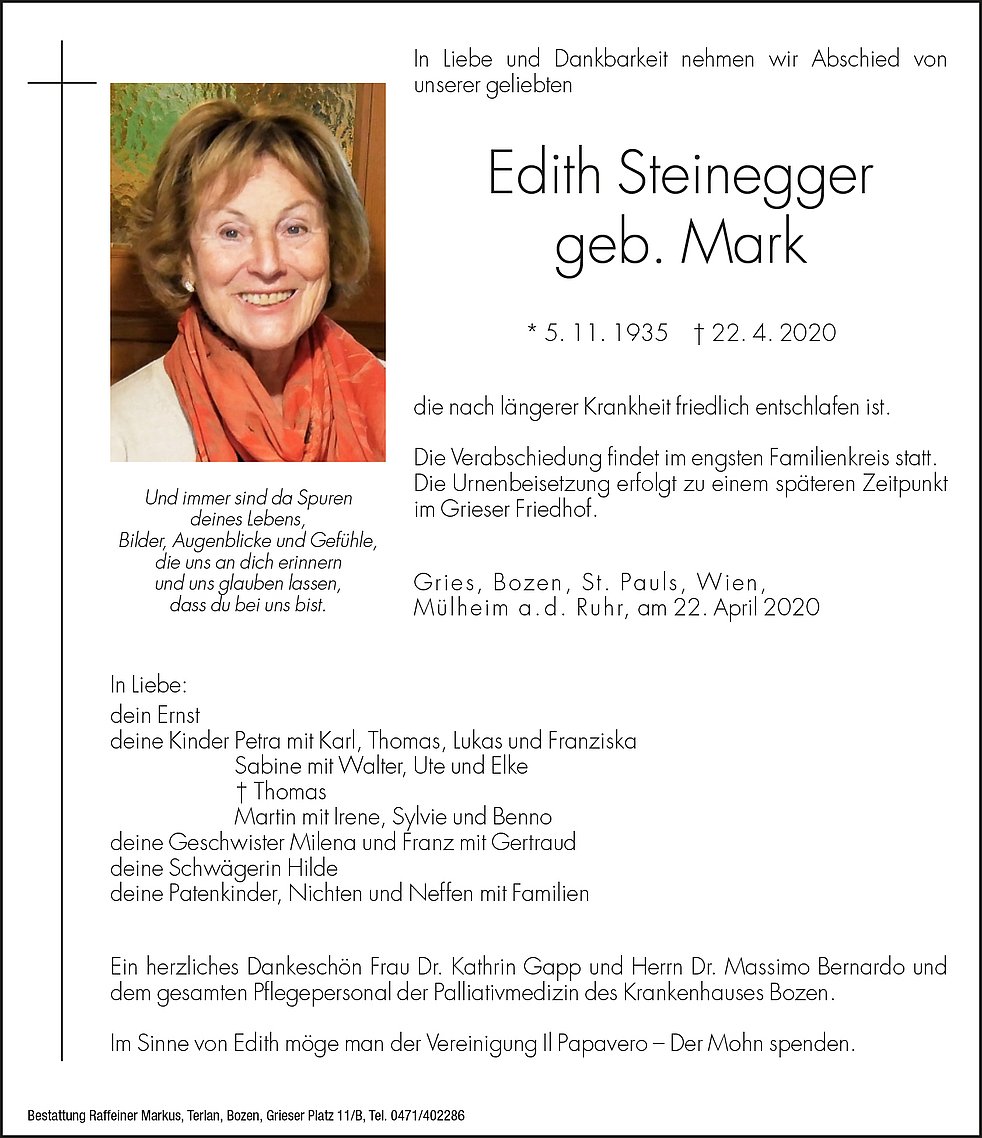Im Sinne von Edith möge man der Vereinigung Il Papavero-Der Mohn spenden