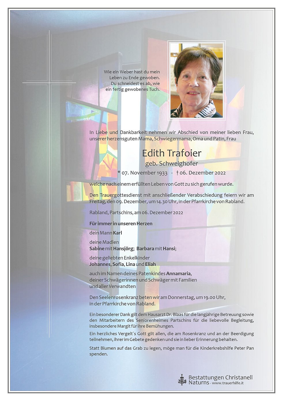 Ein besonderer Dank gilt dem Hausarzt Dr. Blaas für die langjährige Betreuung sowie den Mitarbeitern des Seniorenheimes Partschins für die liebevolle Begleitung, insbesondere Margit für ihre Bemühungen.