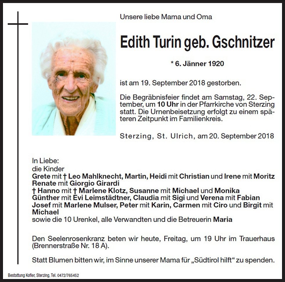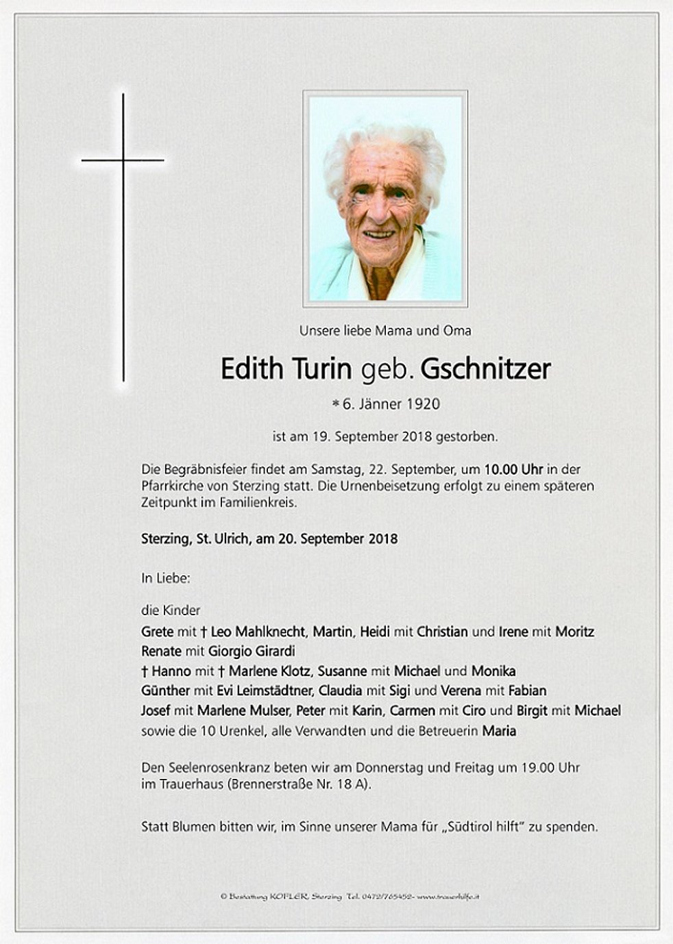 Die Begräbnisfeier findet am Samstag, 22. September, um 10.00 Uhr in der Pfarrkirche von Sterzing statt. Die Urnenbeisetzung erfolgt zu einem späteren Zeitpunkt im Familienkreis.