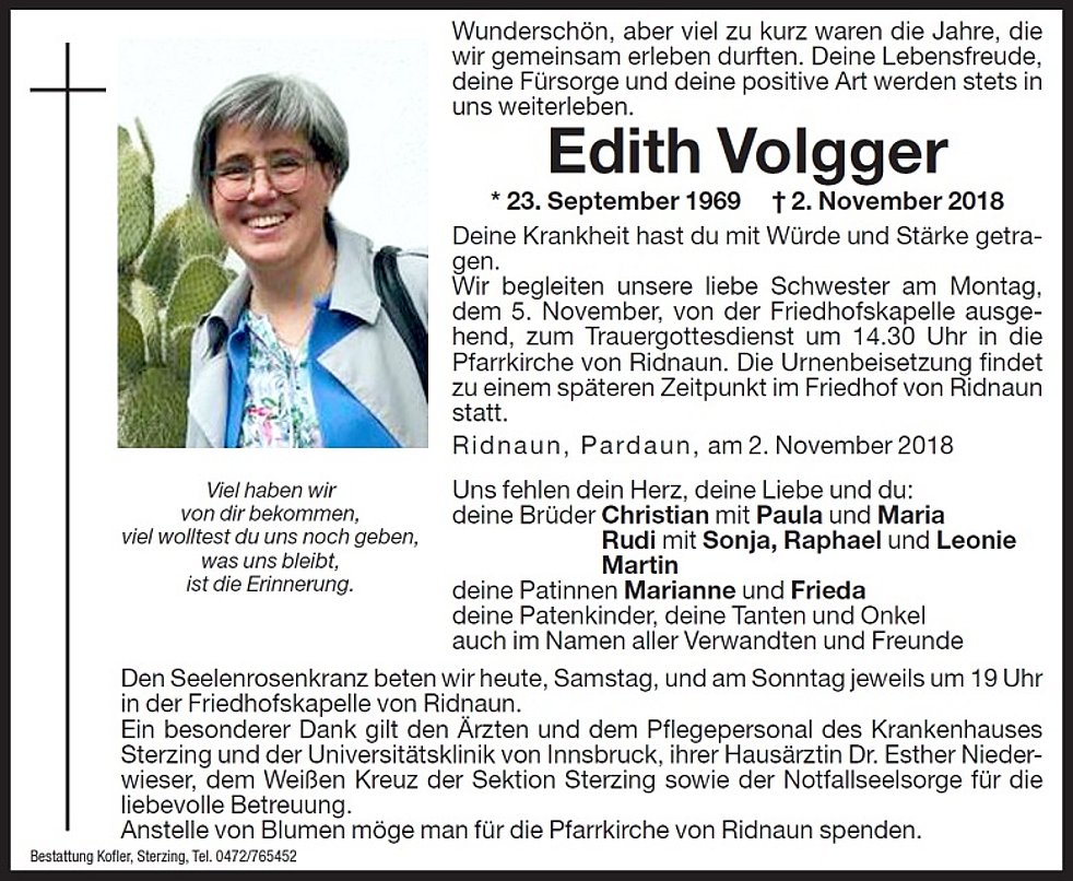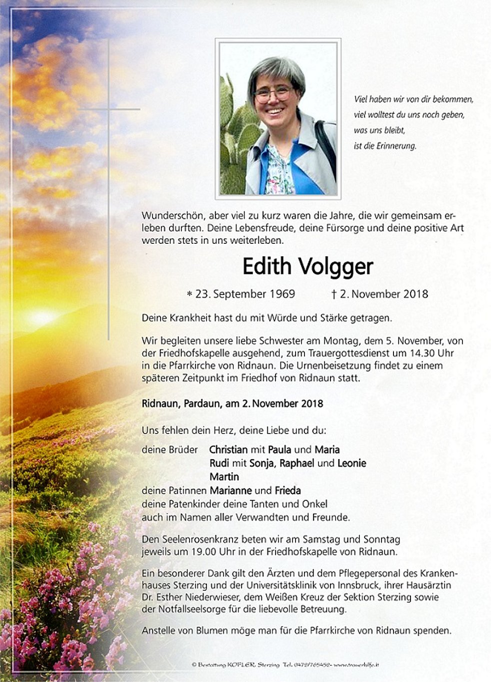Wir begleiten unsere liebe Schwester am Montag, dem 5. November, von der Friedhofskapelle ausgehend, zum Trauergottesdienst um 14.30 Uhr in die Pfarrkirche von Ridnaun. Die Urnenbeisetzung findet zu einem späteren Zeitpunkt im Friedhof von Ridnaun statt.