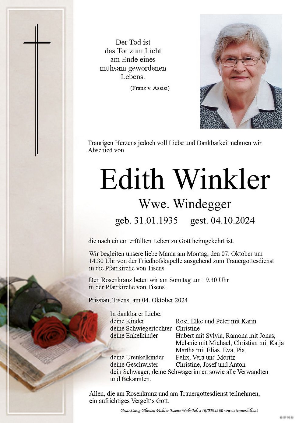 Begräbnisgottesdienst: 07.10. - 14:30 Uhr Pfarrkirche Tisens