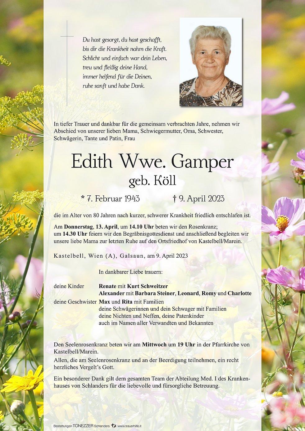 Am Donnerstag, 13. April, um 14.10 Uhr beten wir den Rosenkranz; um 14.30 Uhr feiern wir den Begräbnisgottesdienst und anschließend begleiten wir unsere liebe Mama zur letzten Ruhe auf den Ortsfriedhof von Kastelbell/Marein.