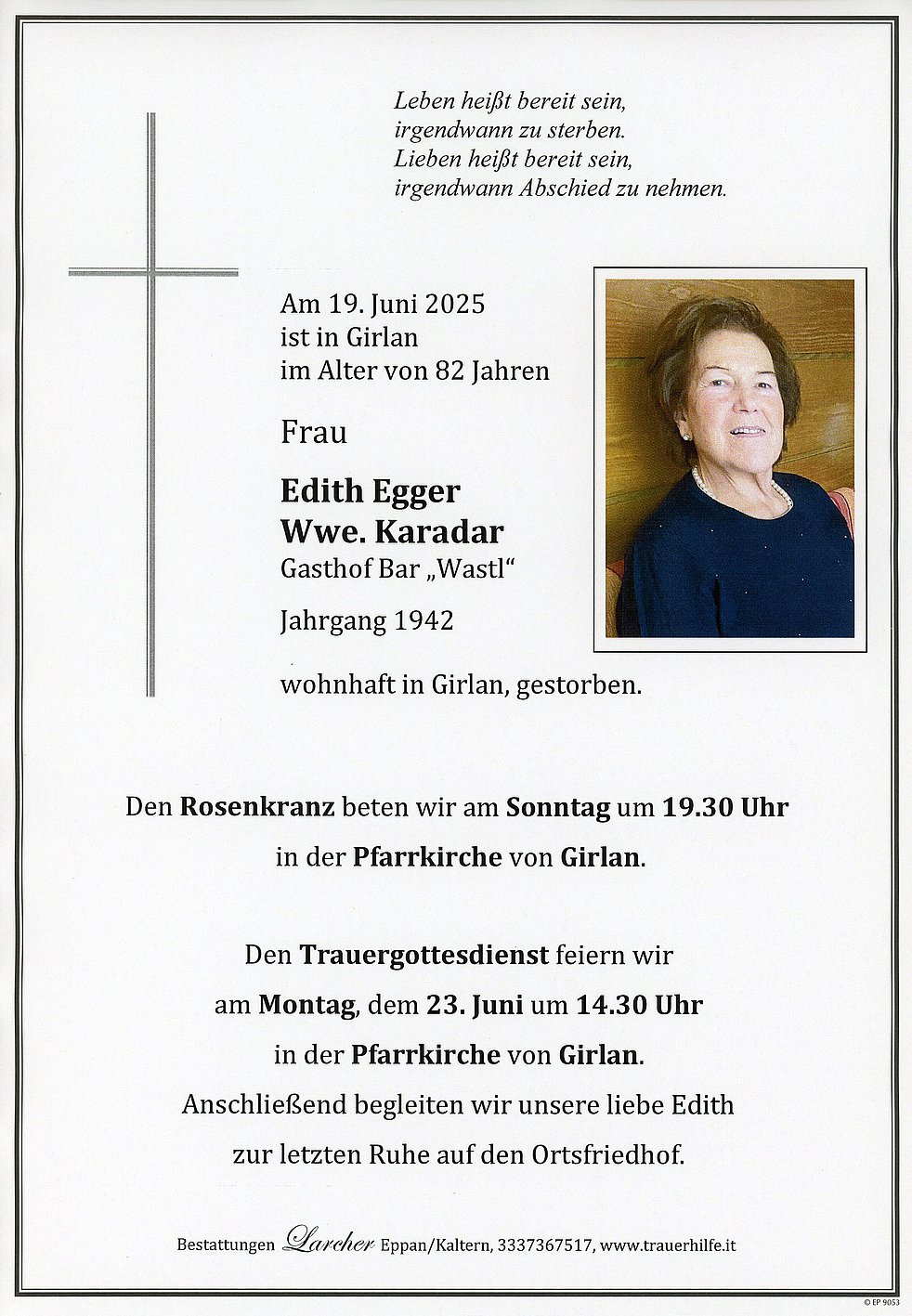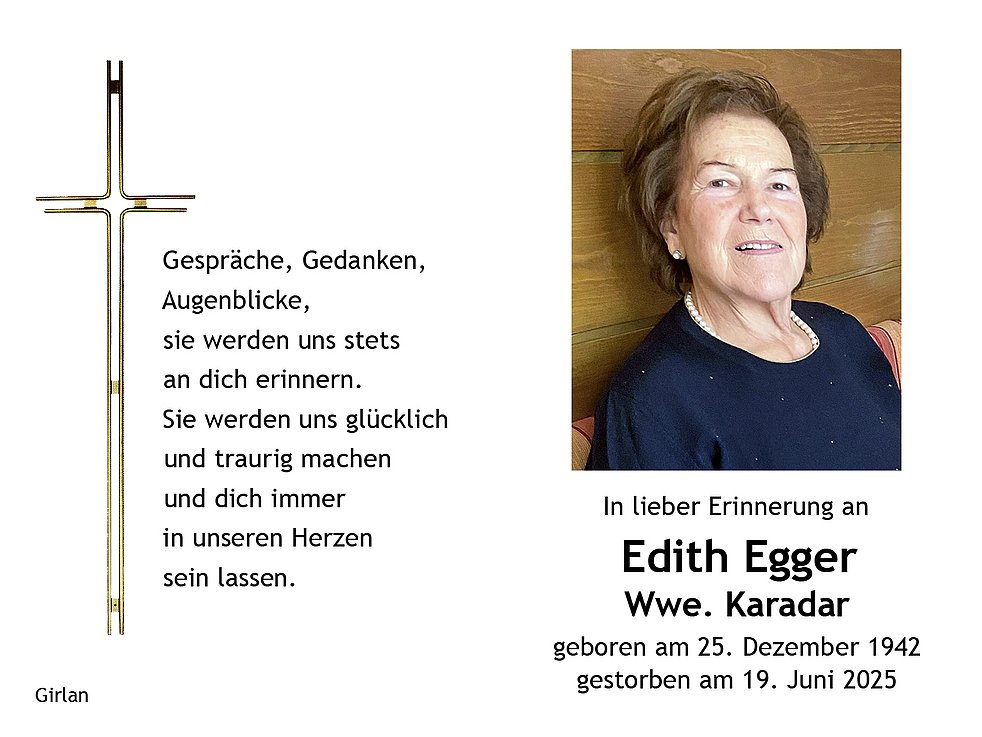 Der Trauergottesdienst findet am Montag, 23. Juni 2025, um 14.30 Uhr in der Pfarrkirche von Girlan statt. Anschließend begleiten wir unsere liebe Verstorbene auf den Ortsfriedhof.