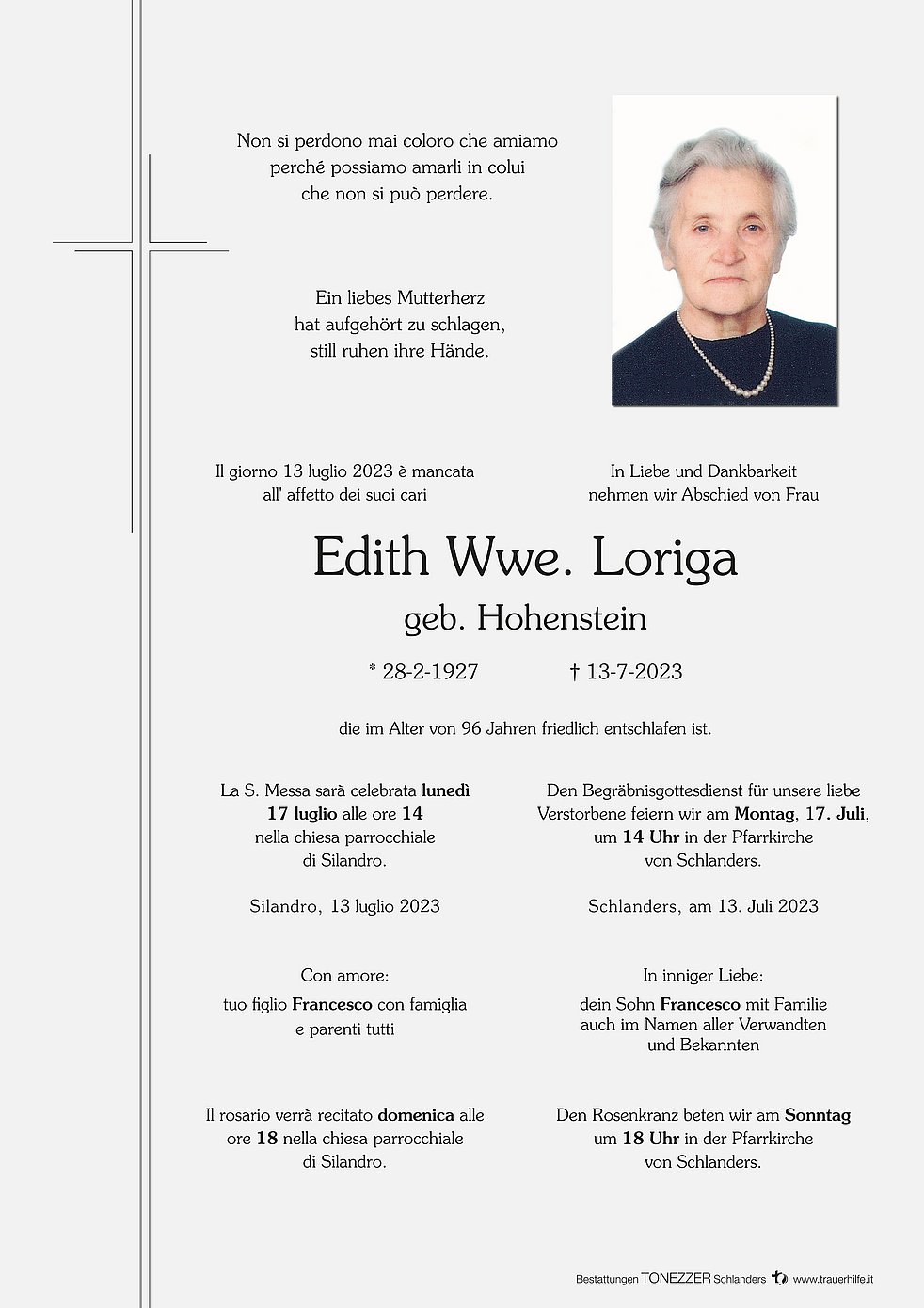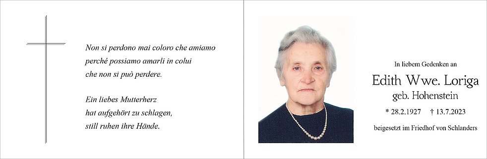 Den Begräbnisgottesdienst für unsere liebe Verstorbene feiern wir am Montag, 17. Juli, um 14 Uhr in der Pfarrkirche von Schlanders.