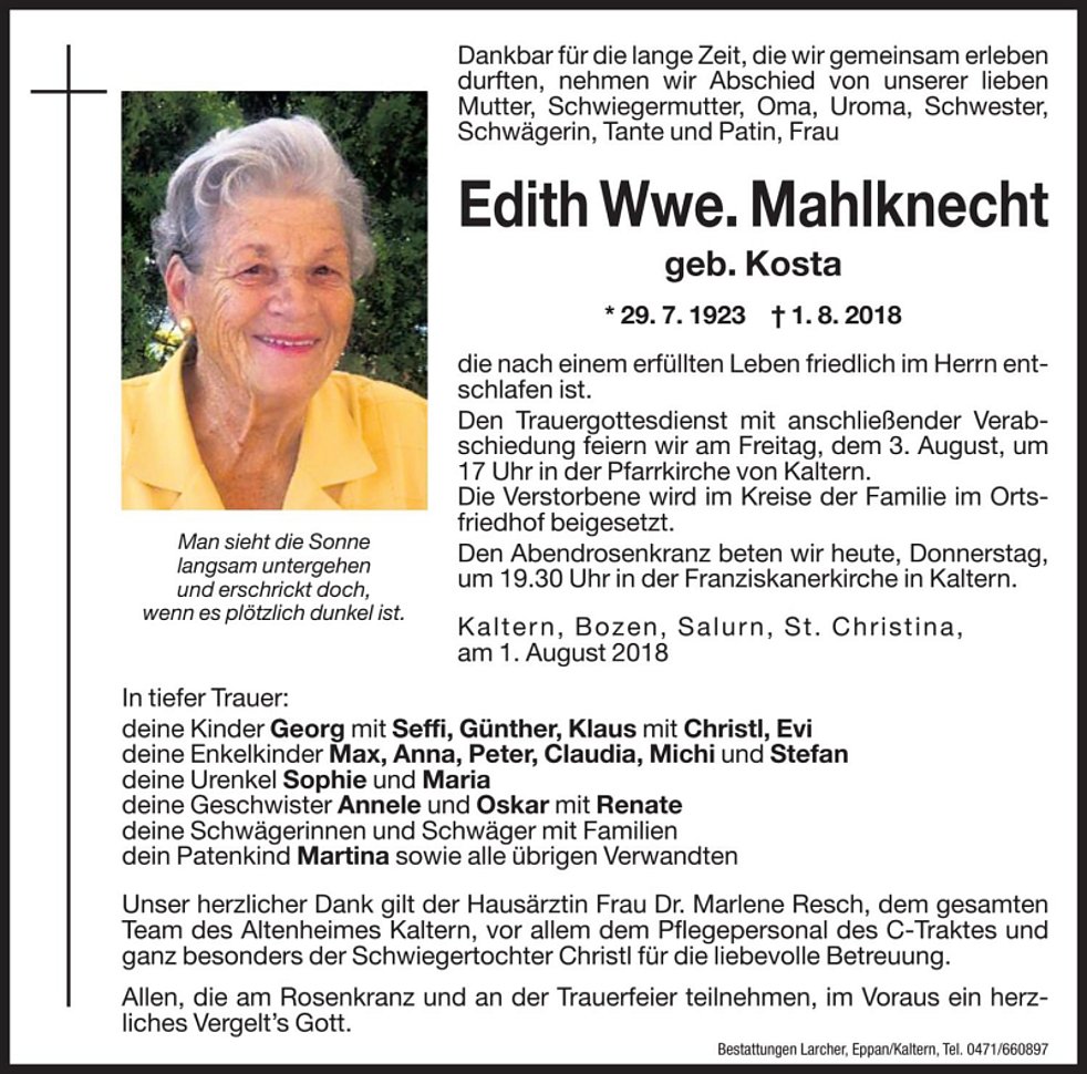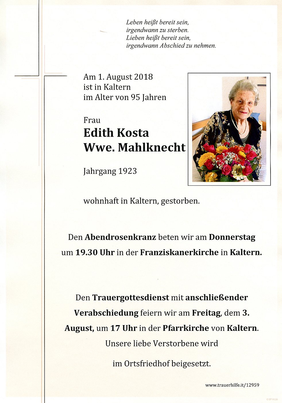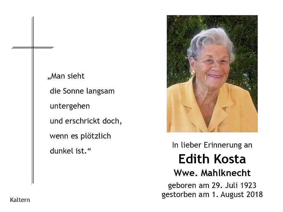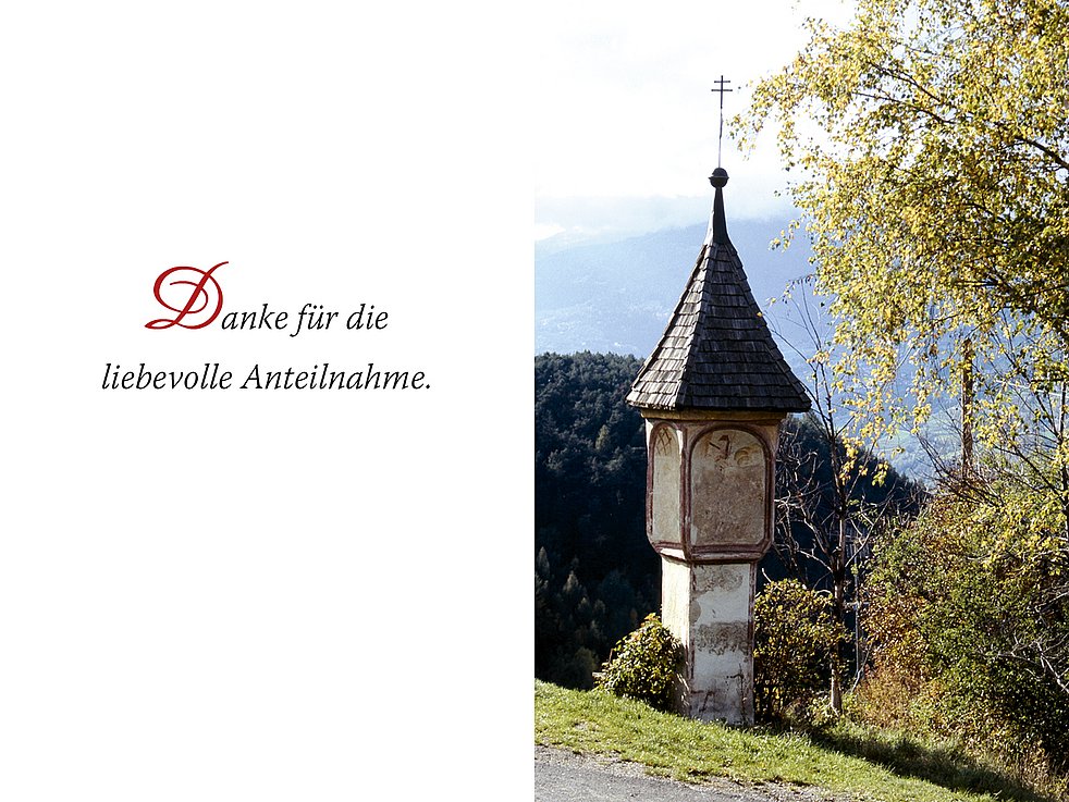 Unser herzlicher Dank gilt der Hausärztin Frau Dr. Marlene Resch, dem gesamten Team des Altenheimes Kaltern, vor allem dem Pflegepersonal des C Traktes und ganz besonders der Schwiegertochter Christl für die liebevolle Betreuung.