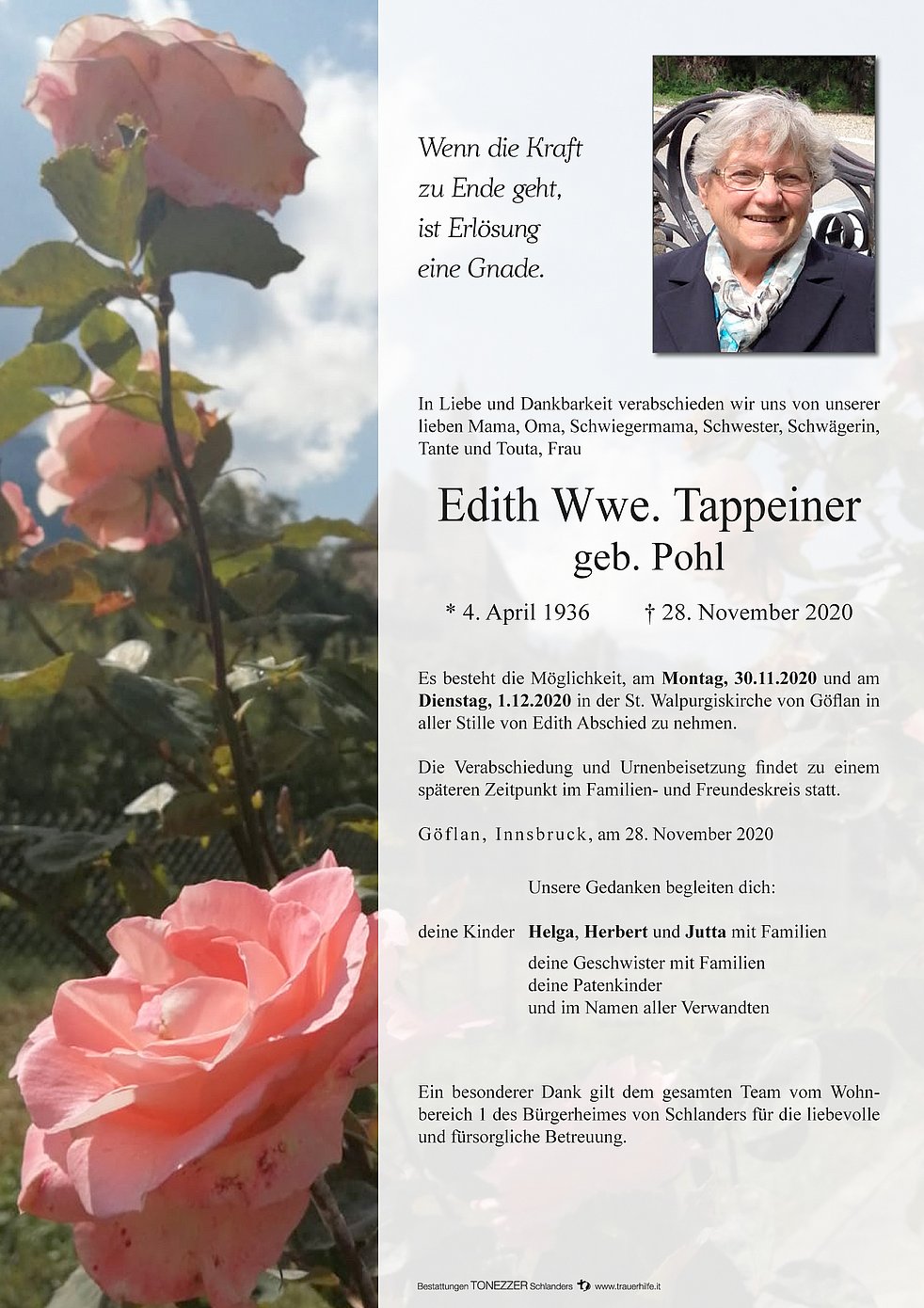 Ein besonderer Dank gilt dem gesamten Team vom Wohnbereich 1 des Bürgerheimes von Schlanders für die liebevolle und fürsorgliche Betreuung.
