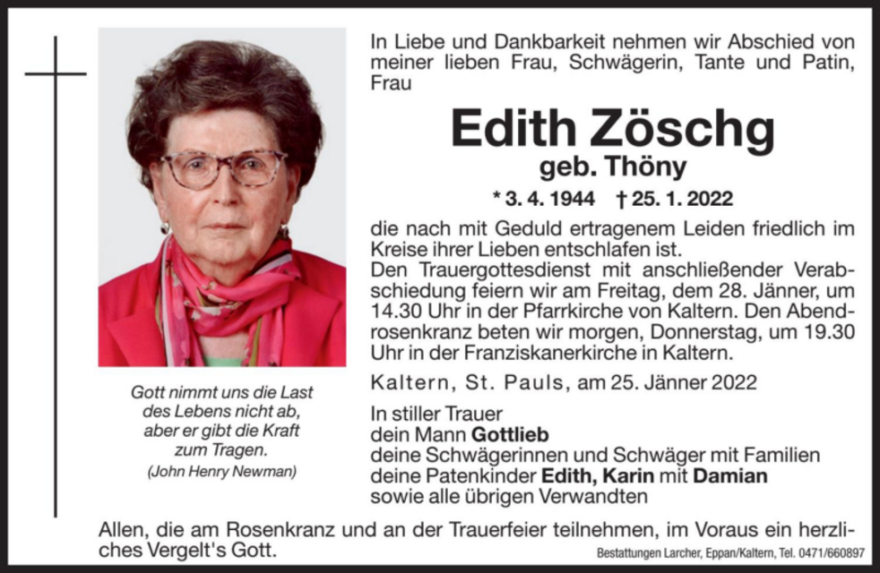 Den Trauergottesdienst mit anschließender Verabschiedung feiern wir am Freitag, dem 28. Jänner um 14.30 Uhr in der Pfarrkirche von Kaltern.