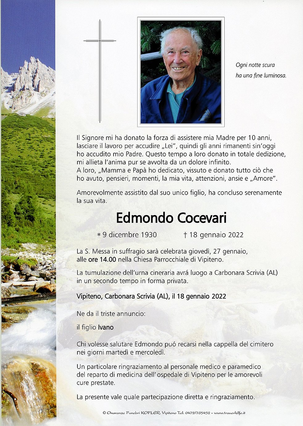 La S. Messa in suffragio sarà celebrata giovedì, 27 gennaio, alle ore 14.00 nella Chiesa Parrocchiale di Vipiteno.
