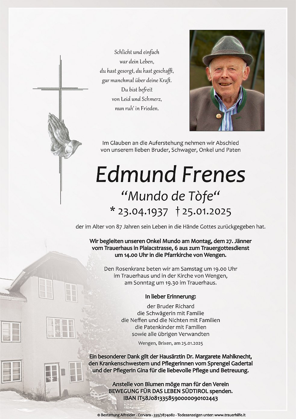 Begräbnisgottesdienst: 27.01. - 14:00 Uhr Pfarrkirche Wengen