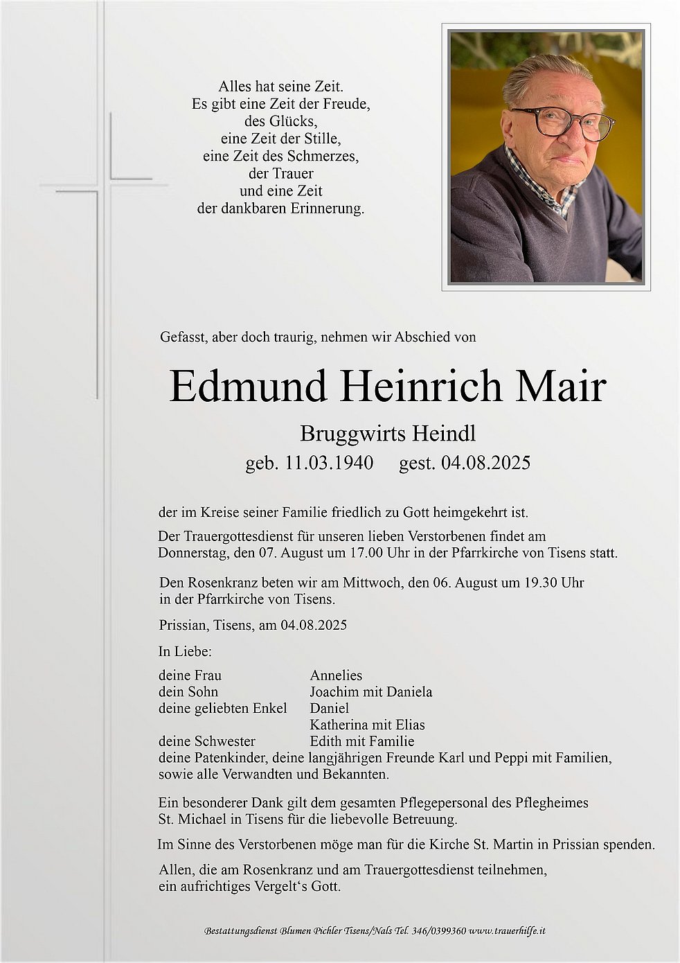 Trauerfeier: 07.08. - 17:00 Uhr Pfarrkirche Tisens