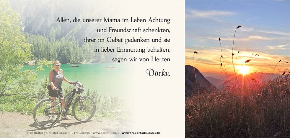 Ein herzlicher Dank gilt den Ärzten und dem Pflegepersonal der Abteilung Onkologie am Krankenhaus Bruneck sowie allen, die uns in dieser schweren Zeit zur Seite gestanden sind.