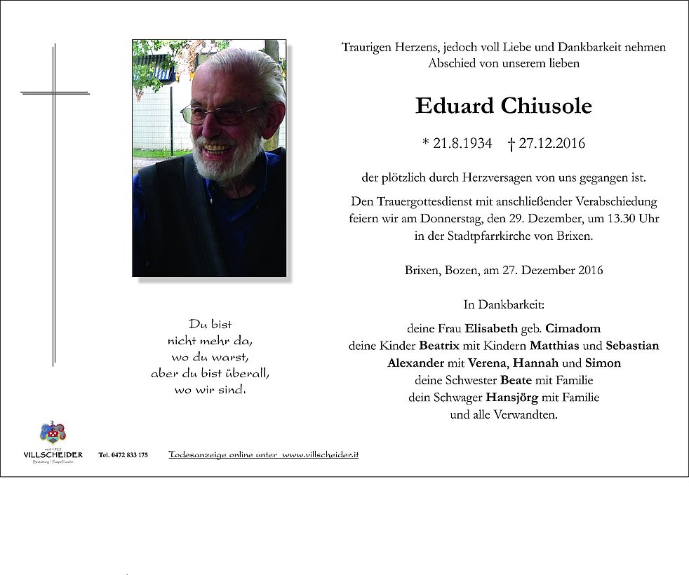 Den Trauergottesdienst mit anschließender Verabschiedung feiern wir am Donnerstag, den 29. Dezember, um 13.30 Uhr