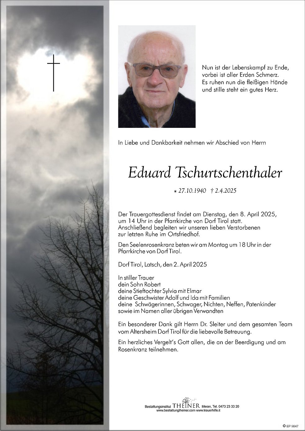 Der Trauergottesdienst findet am Dienstag, den 8. April 2025, um 14 Uhr in der Pfarrkirche von Dorf Tirol statt.