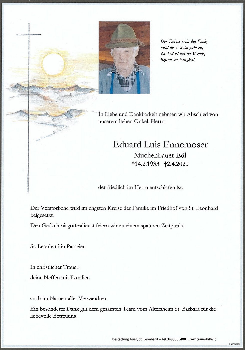 Der Verstorbene wird im engsten Kreise der Familie im Friedhof von St. Leonhard beigesetzt.