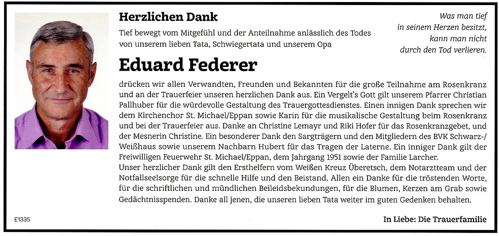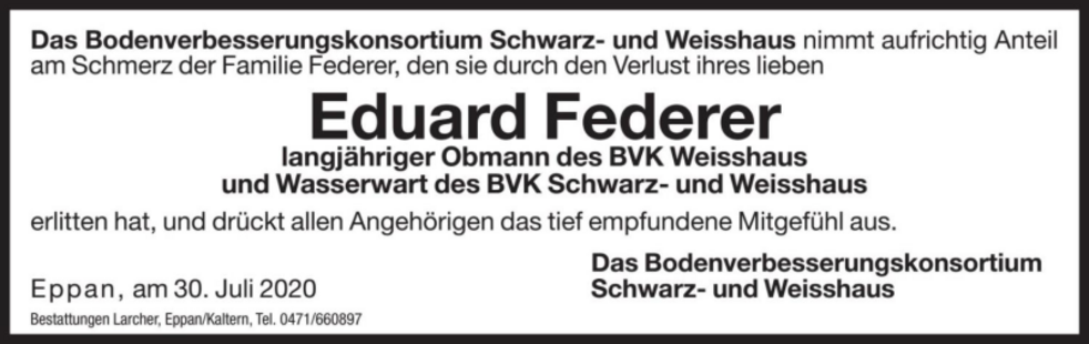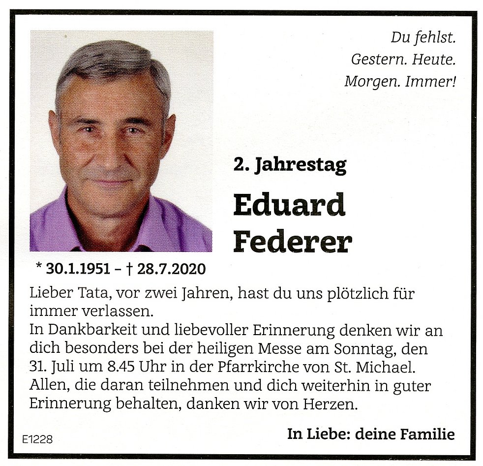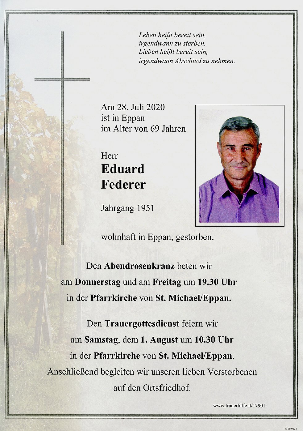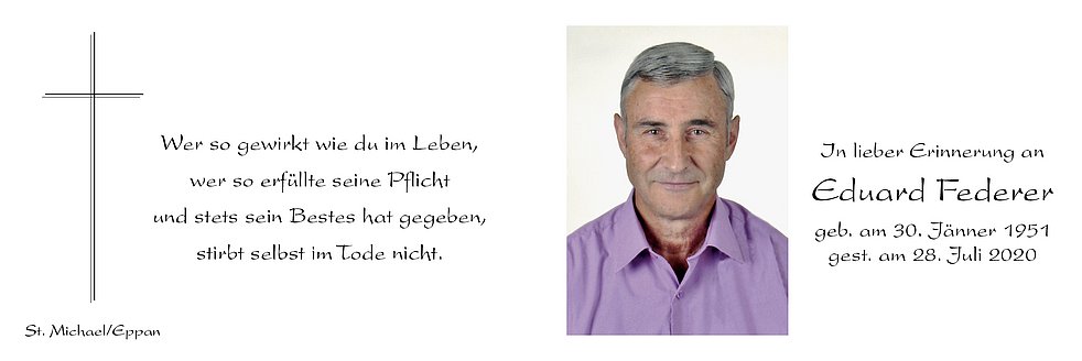 Den Trauergottesdienst feiern wir am Samstag, dem 1. August um 10.30 Uhr in der Pfarrkirche von St. Michael/Eppan. Anschließend begleiten wir unseren lieben Verstorbenen auf den Ortsfriedhof. Den Abendrosenkranz beten wir am Donnerstag, und am Freitag, um 19.30 Uhr in der Pfarrkirche von St. Michael/Eppan.