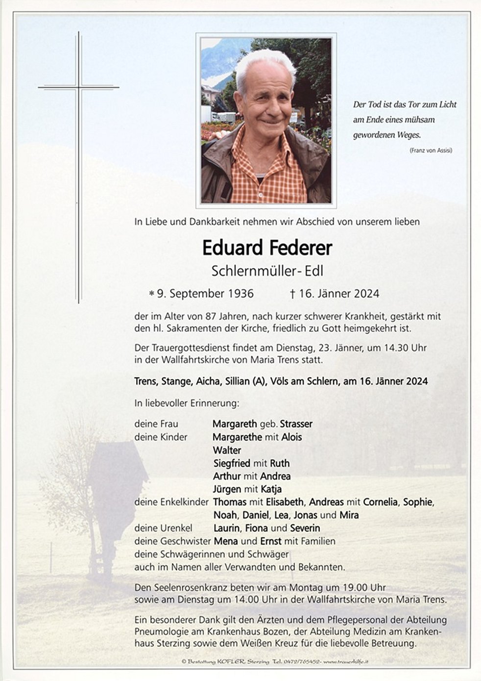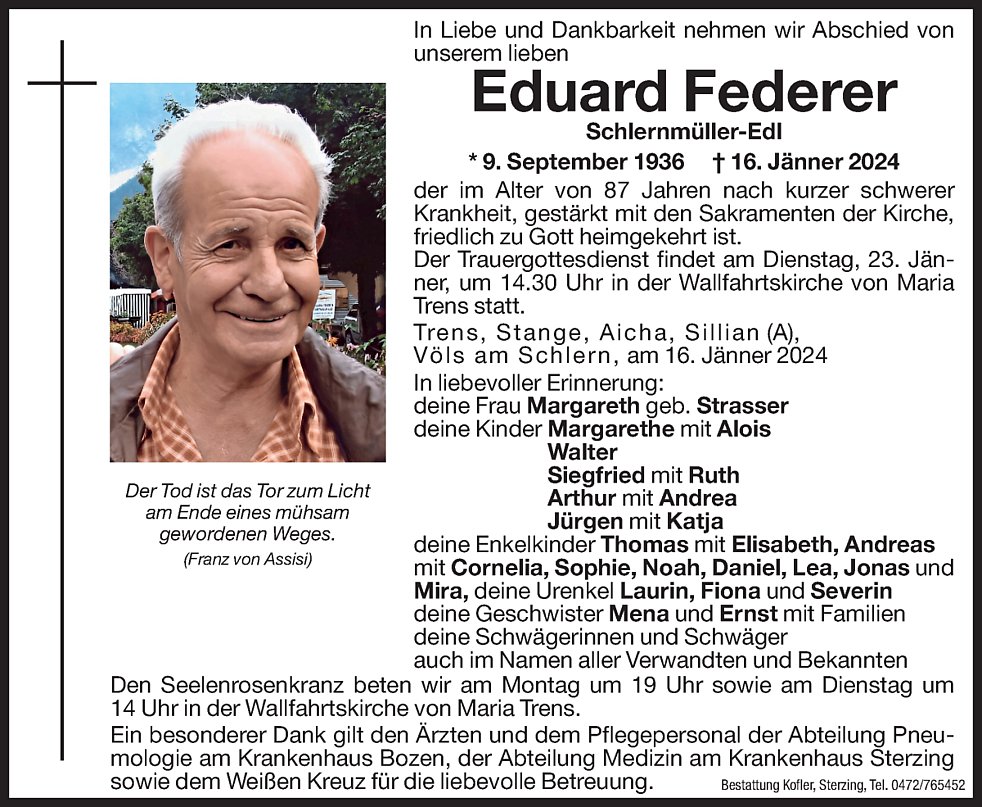 Der Trauergottesdienst findet am Dienstag, 23. Jänner, um 14.30 Uhr in der Wallfahrtskirche von Maria Trens statt.