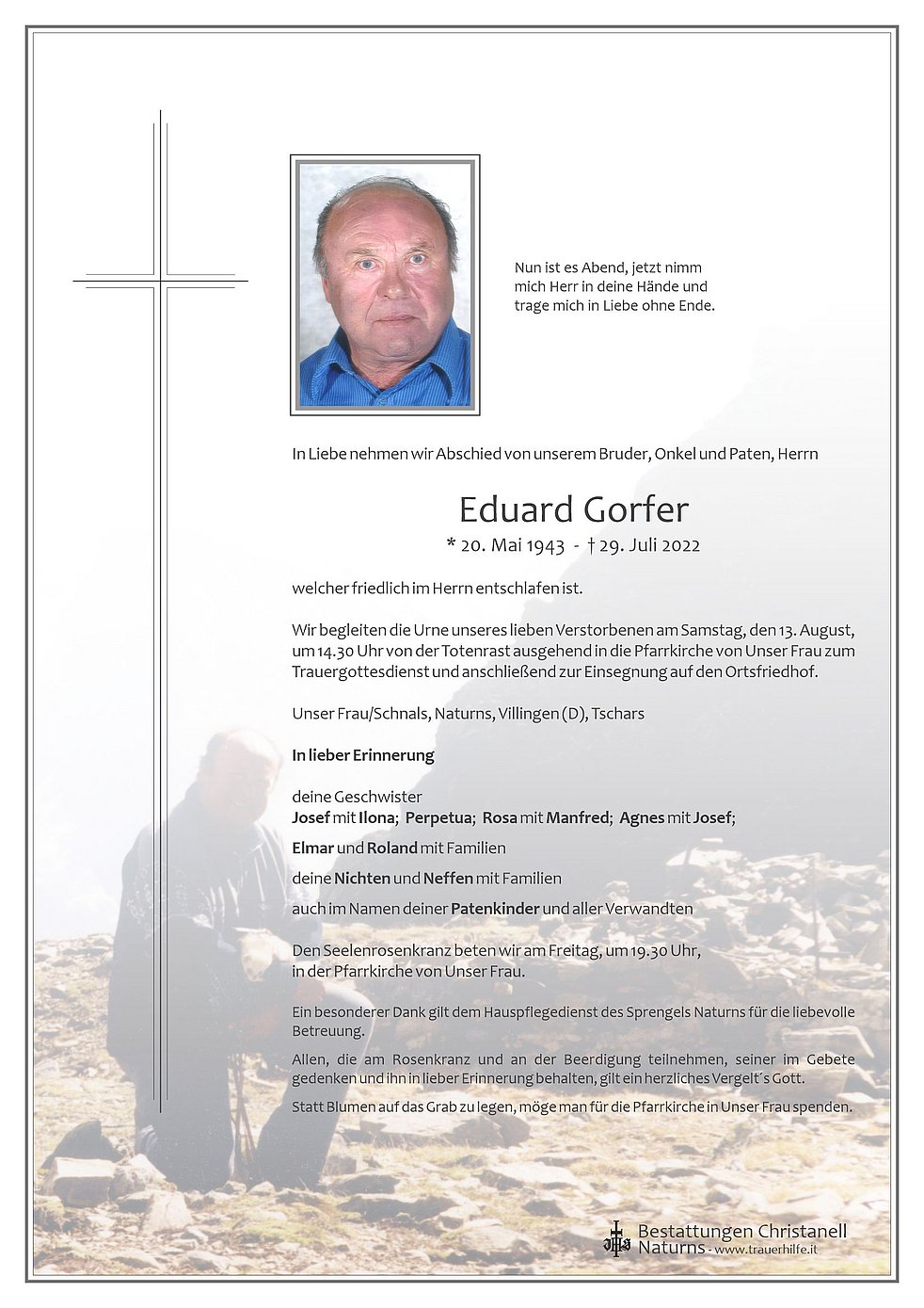 Wir begleiten die Urne unseres lieben Verstorbenen am Samstag, den 13. August, um 14.30 Uhr von der Totenrast ausgehend in die Pfarrkirche von Unser Frau zum Trauergottesdienst und anschließend zur Einsegnung auf den Ortsfriedhof.