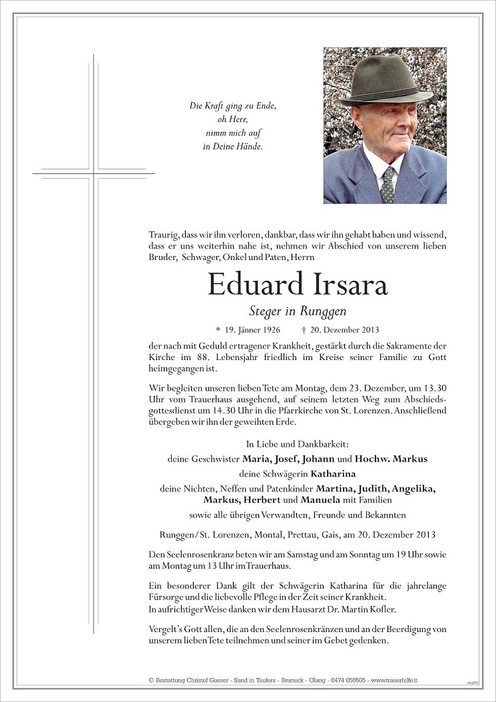 Wir begleiten unseren lieben Tete am Montag, dem 23. Dezember, um 13.30 Uhr vom Trauerhaus ausgehend, auf seinem letzten Weg zum Abschieds-gottesdienst um 14.30 Uhr in die Pfarrkirche von St. Lorenzen. Anschließend übergeben wir ihn der geweihten Erde.