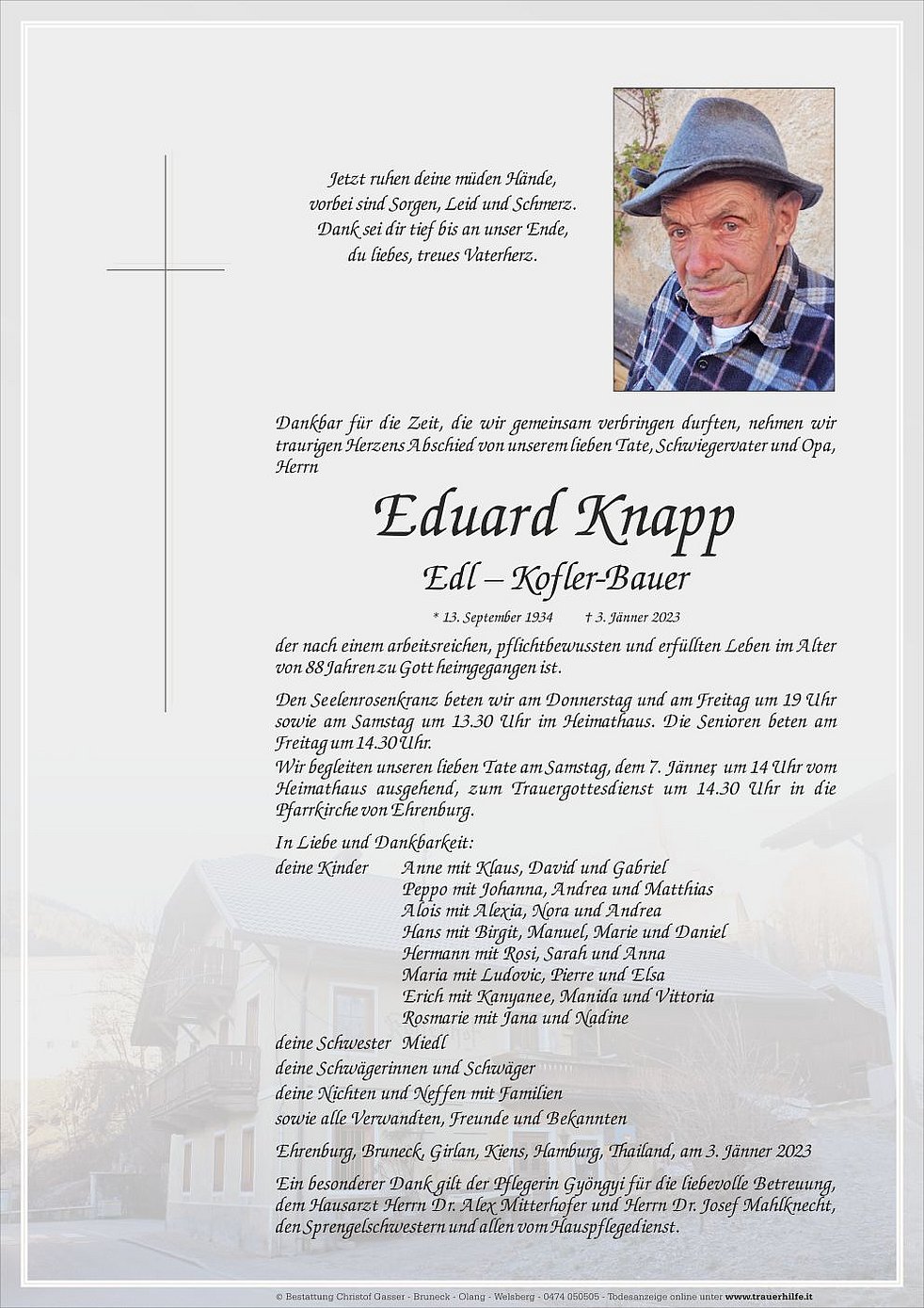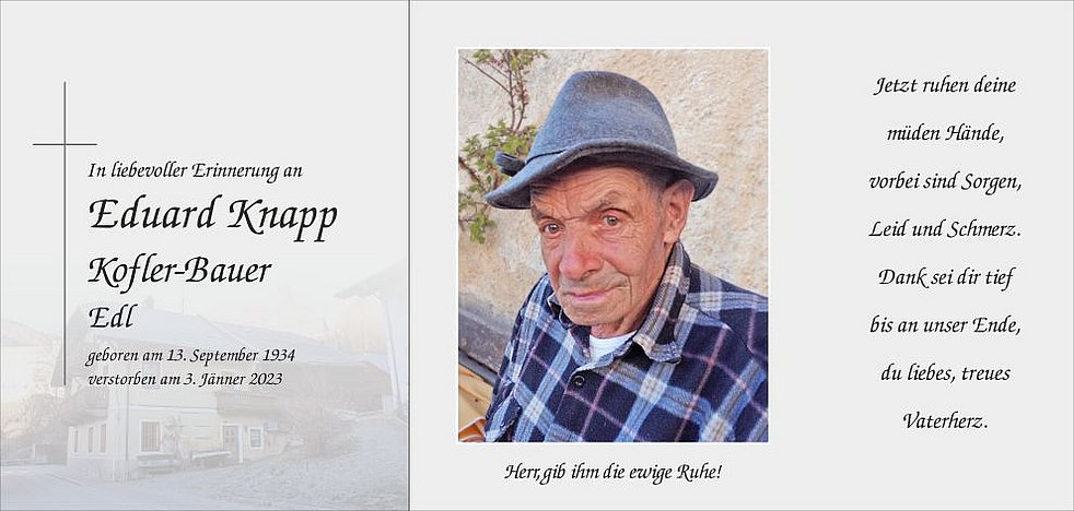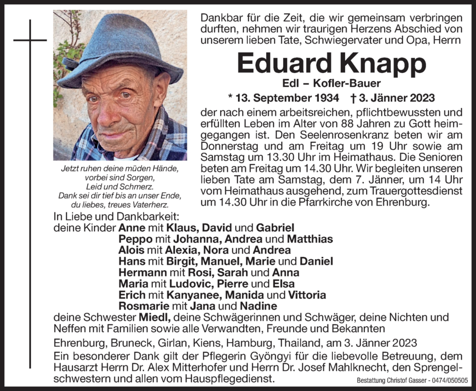 Wir begleiten unseren lieben Tate am Samstag, dem 7. Jänner, um 14 Uhr vom Heimathaus ausgehend, zum Trauergottesdienst um 14.30 Uhr in die Pfarrkirche von Ehrenburg.