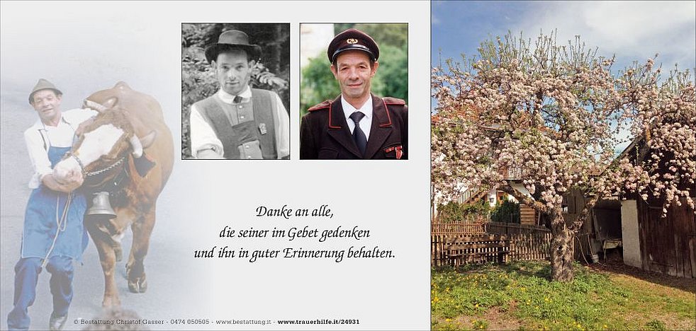 Ein besonderer Dank gilt der Pflegerin Gyöngyi für die liebevolle Betreuung, dem Hausarzt Herrn Dr. Alex Mitterhofer und Herrn Dr. Josef Mahlknecht, den Sprengelschwestern und allen vom Hauspflegedienst.