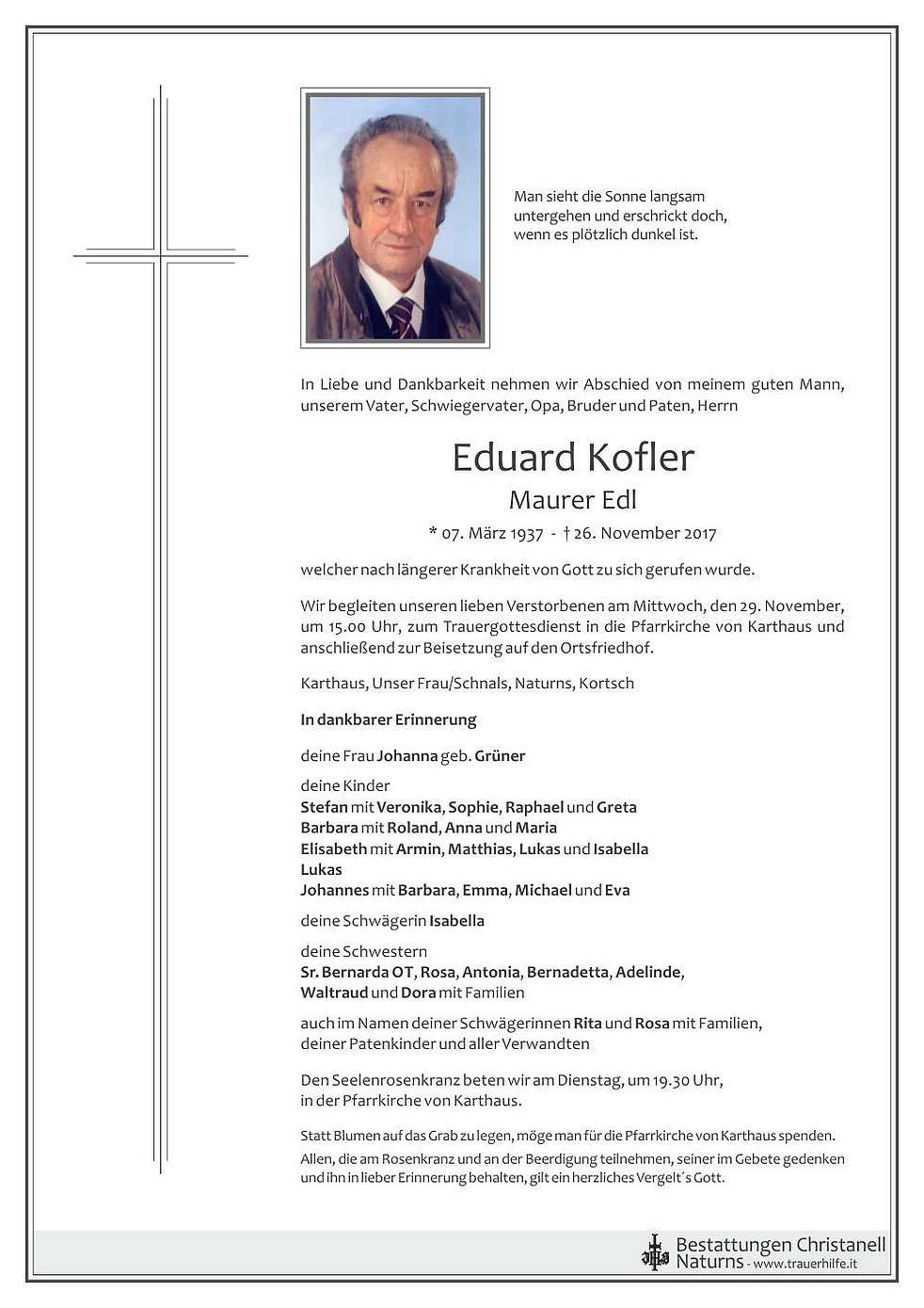 Wir begleiten unseren lieben Verstorbenen am Mittwoch, den 29. November, um 15.00 Uhr, zum Trauergottesdienst in die Pfarrkirche von Karthaus und anschließend zur Beisetzung auf den Ortsfriedhof.