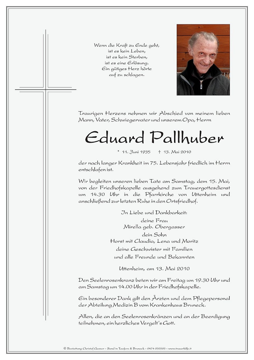 Wir begleiten unseren lieben Tate am Samstag, dem 15. Mai, von der Friedhofskapelle ausgehend zum Trauergottesdienst um 14.30 Uhr in die Pfarrkirche von Uttenheim und anschließend zur letzten Ruhe in den Ortsfriedhof.