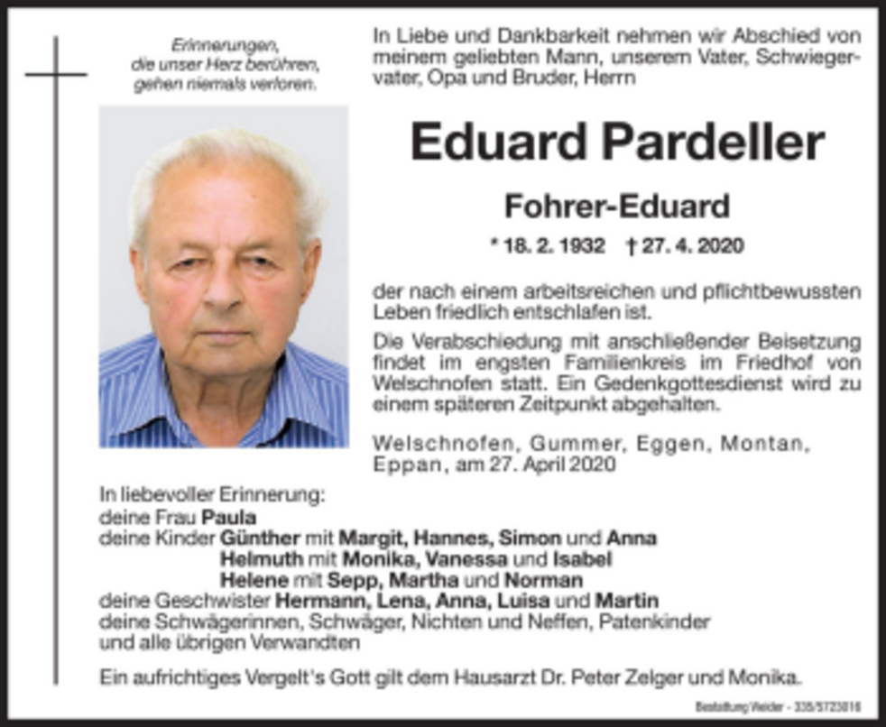 Die Verabschiedung mit anschließender Beisetzung findet im engsten Familienkreis im Friedhof von Welschnofen statt. Ein Gedenkgottesdienst wird zu einem späteren Zeitpunkt abgehalten.