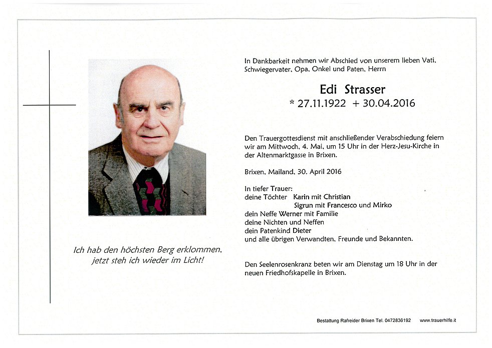 Den Trauergottesdienst mit anschließender Verabschiedung feiern wir am Mittwoch, 4. Mai, um 15 Uhr in der Herz-Jesu-Kirche in der Altenmarktgasse in Brixen.