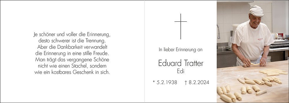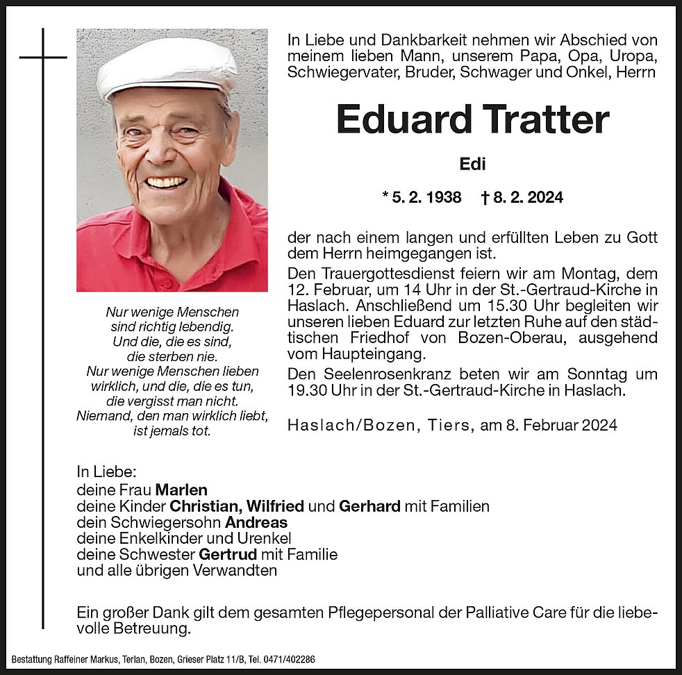 Den Trauergottesdienst feiern wir am Montag, dem 12. Februar, um 14 Uhr in der St. Gertraud-Kirche in Haslach. Anschließend um 15.30 Uhr begleiten wir unseren lieben Eduard zur letzten Ruhe auf den städtischen Friedhof von Bozen-Oberau, ausgehend vom Haupteingang.