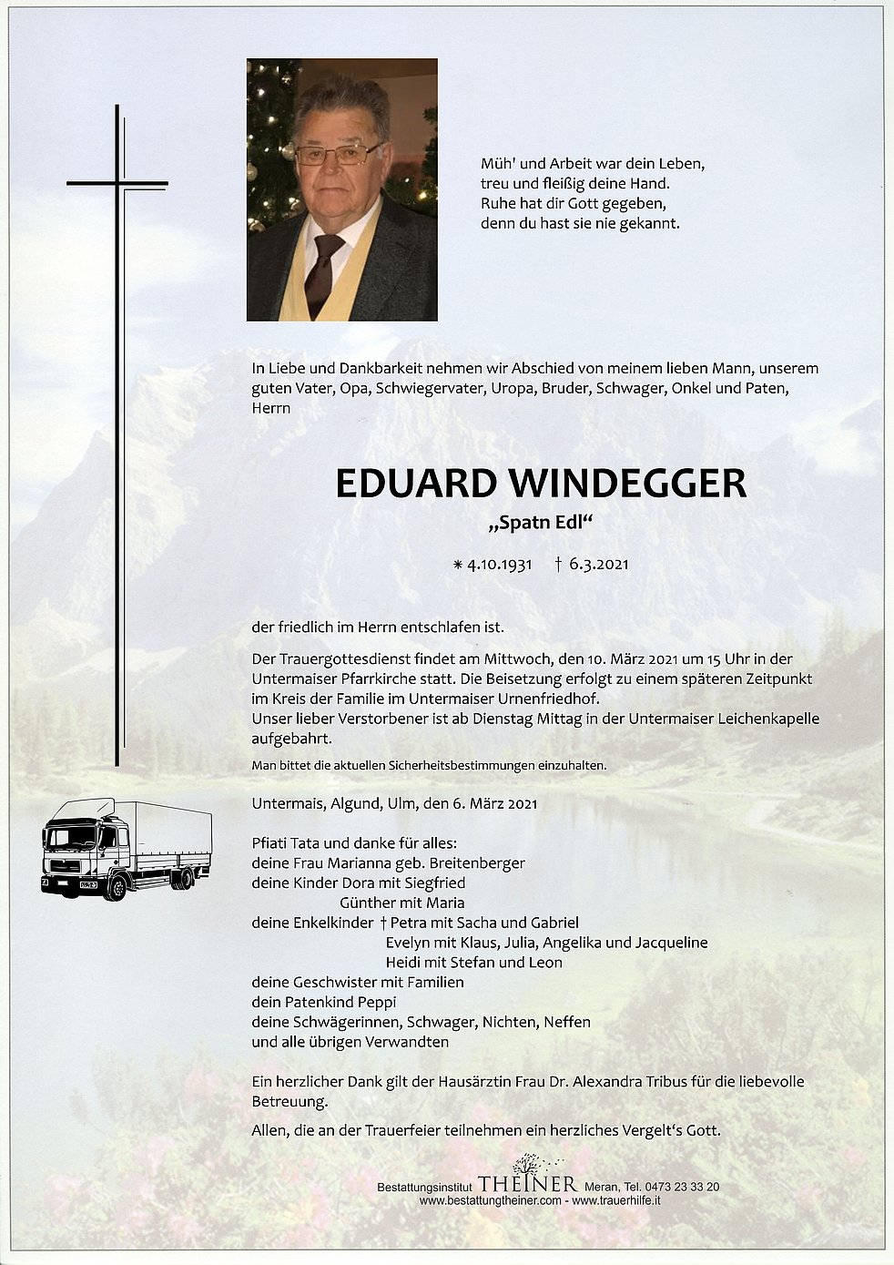 Der Trauergottesdienst findet am Mittwoch, den 10. März 2021 um 15 Uhr in der Untermaiser Pfarrkirche statt. Die Beisetzung erfolgt zu einem späteren Zeitpunkt im Kreis der Familie im Untermaiser Urnenfriedhof.