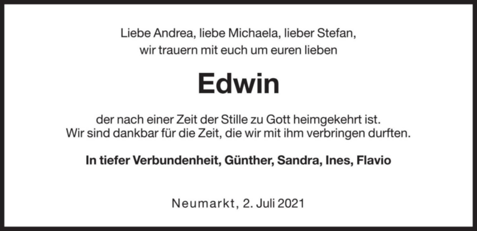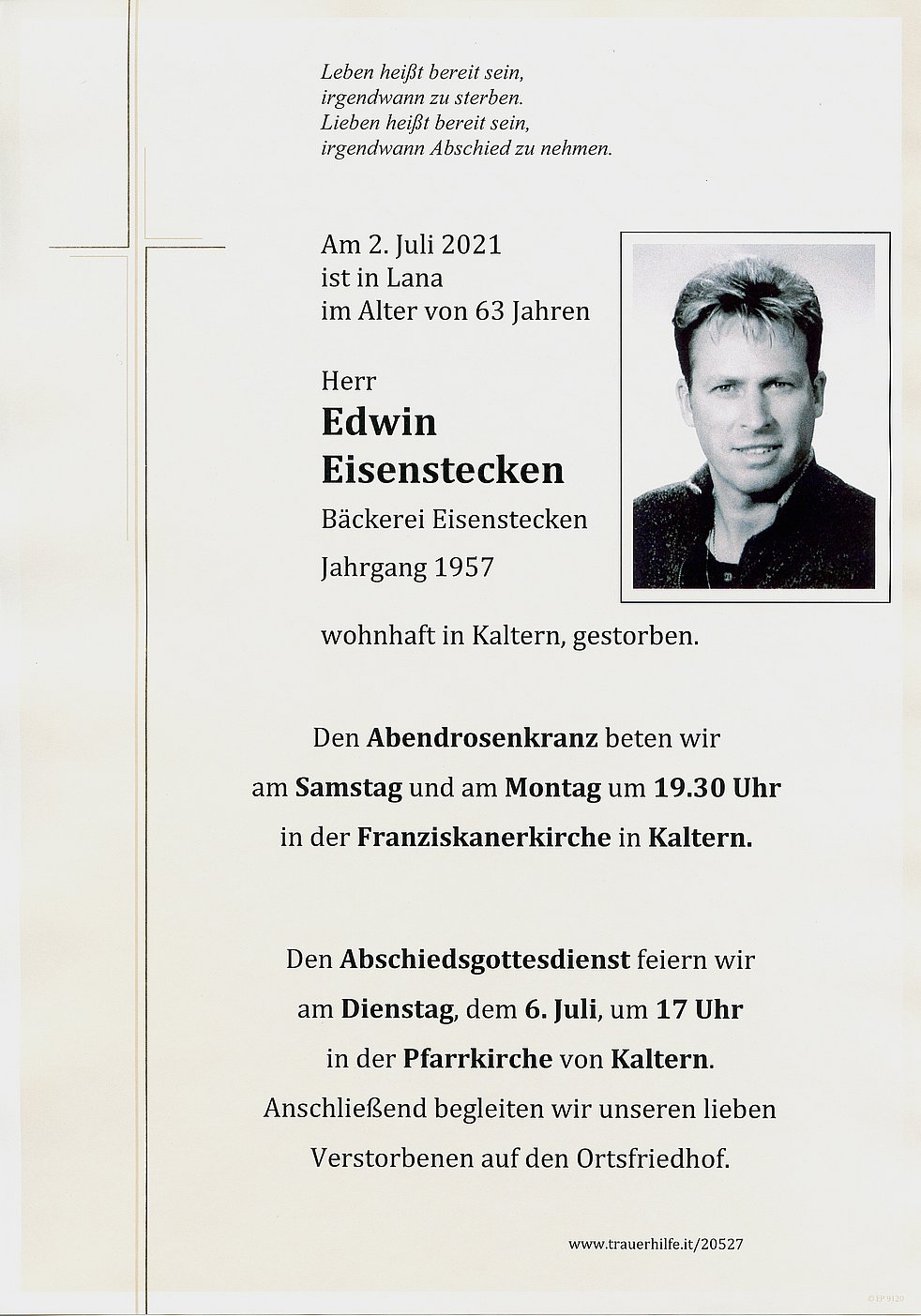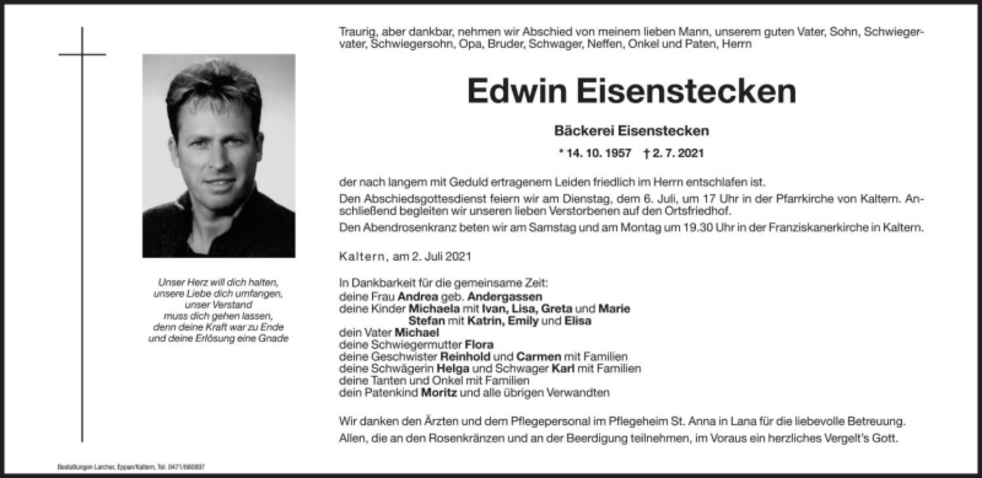 Den Abschiedsgottesdienst feiern wir am Dienstag, dem 6. Juli um 17 Uhr in der Pfarrkirche von Kaltern. Anschließend begleiten wir unseren lieben Verstorbenen auf den Ortsfriedhof.