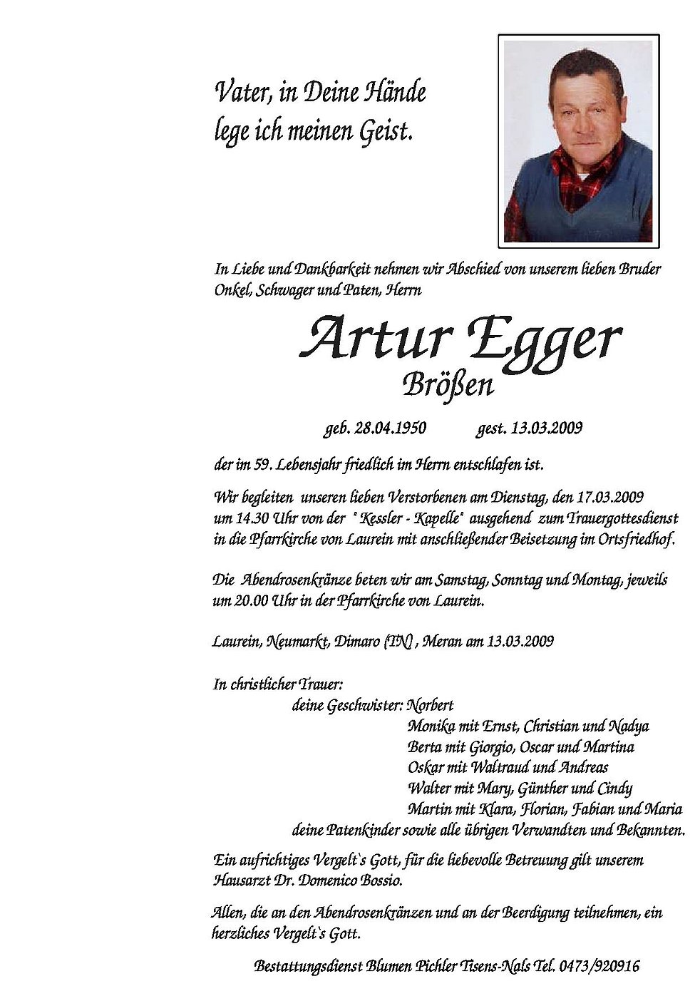 Bestattungsdienst Blumen Pichler Tisens-Nals Tel. 0473/920916
