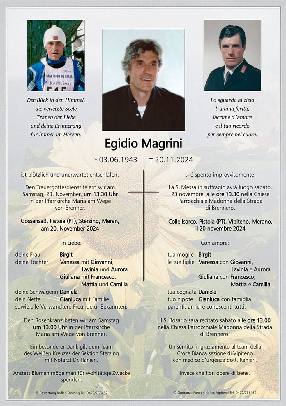 La S. Messa in suffragio avrá luogo sabato, 23 novembre, alle ore 13.30 nella Chiesa Parrocchiale Madonna della Strada di Brennero.