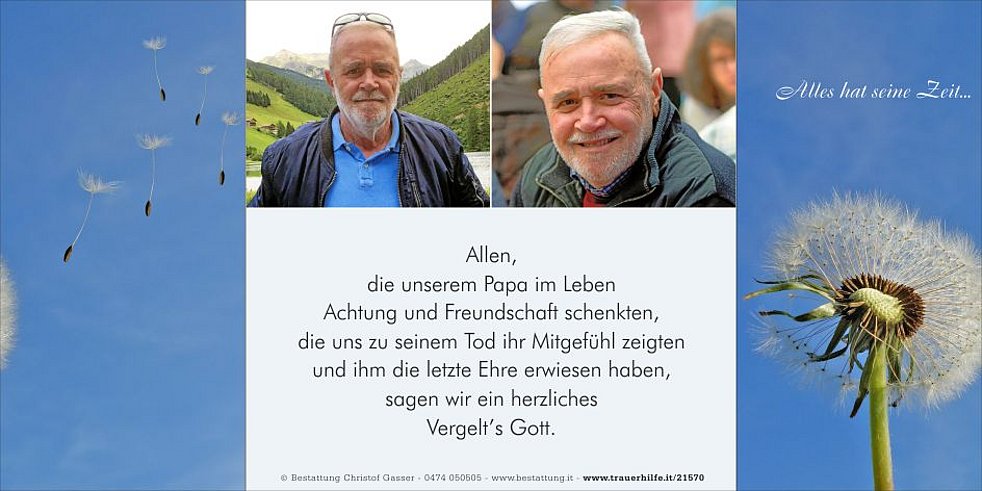 Ein herzlicher Dank gilt dem Hausarzt Herrn Dr. Manfred Walde sowie den Ärzten und dem Pflegepersonal der Abteilungen Onkologie und Palliativmedizin am Krankenhaus Bruneck. Ein herzliches Vergelt’s Gott sagen wir seiner Schwester Anni für die wertvolle Zeit und aufopfernde Hilfe, die sie unserem Papa geschenkt hat.