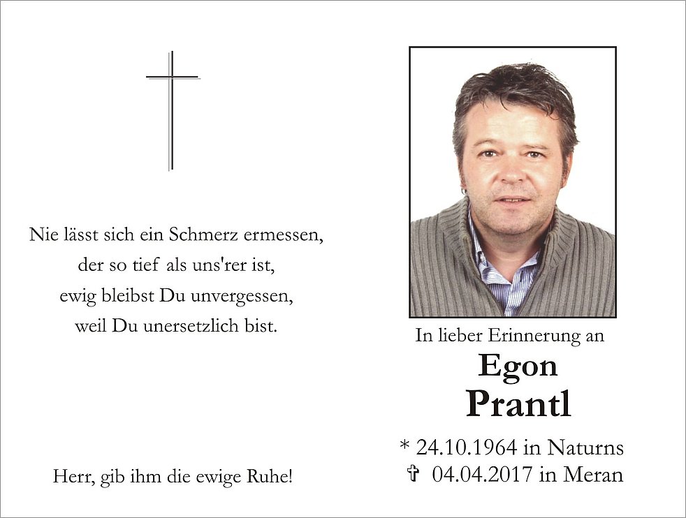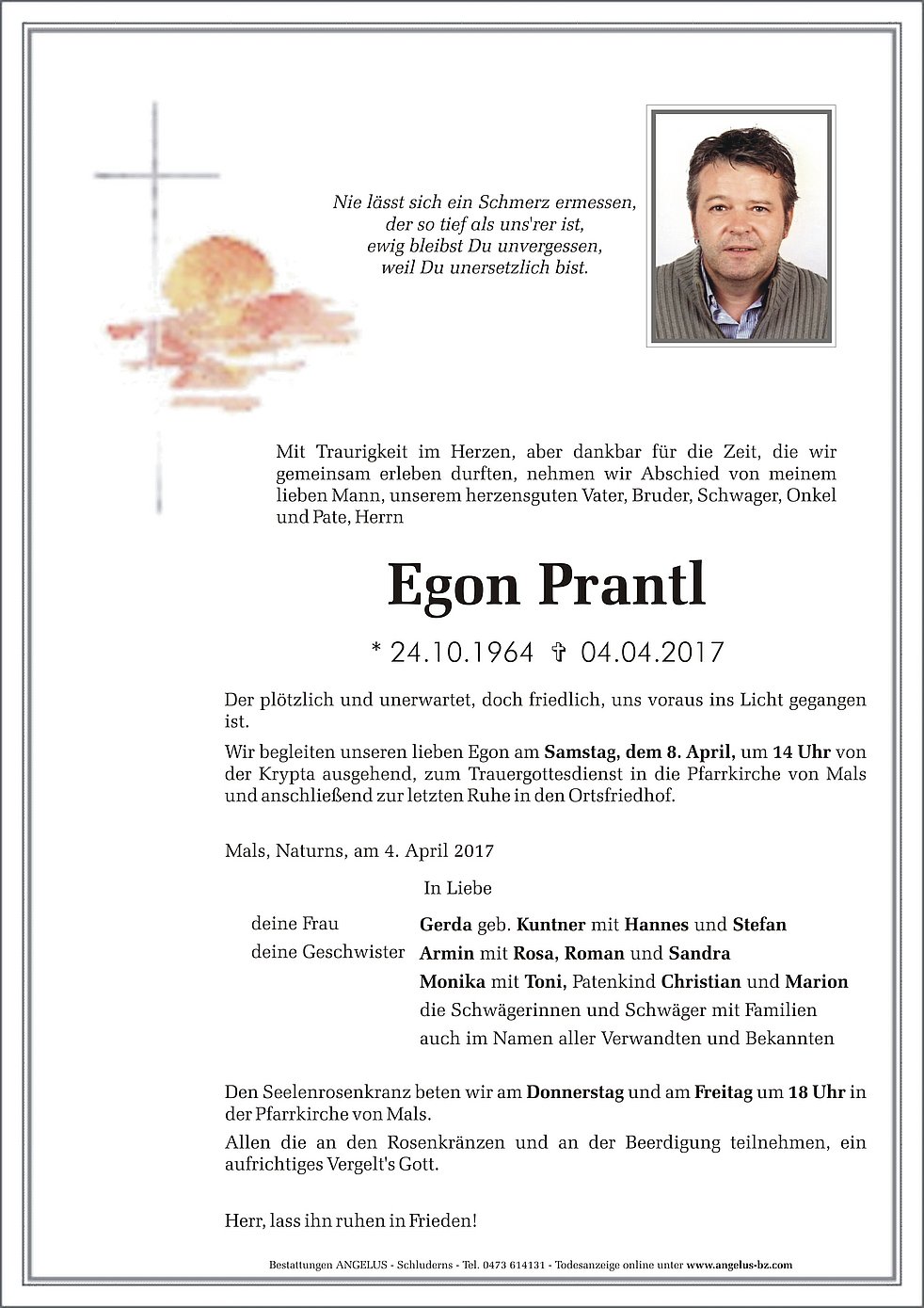 Wir begleiten unseren lieben Egon am Samstag, dem 8. April, um 14 Uhr von der Krypta ausgehend, zum Trauergottesdienst in die Pfarrkirche von Mals und anschließend zur letzten Ruhe in den Ortsfriedhof.
