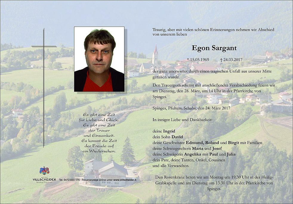 Den Trauergottesdienst mit anschließender Verabschiedung feiern wir am Dienstag, den 28. März, um 14 Uhr in der Pfarrkirche von Spinges.