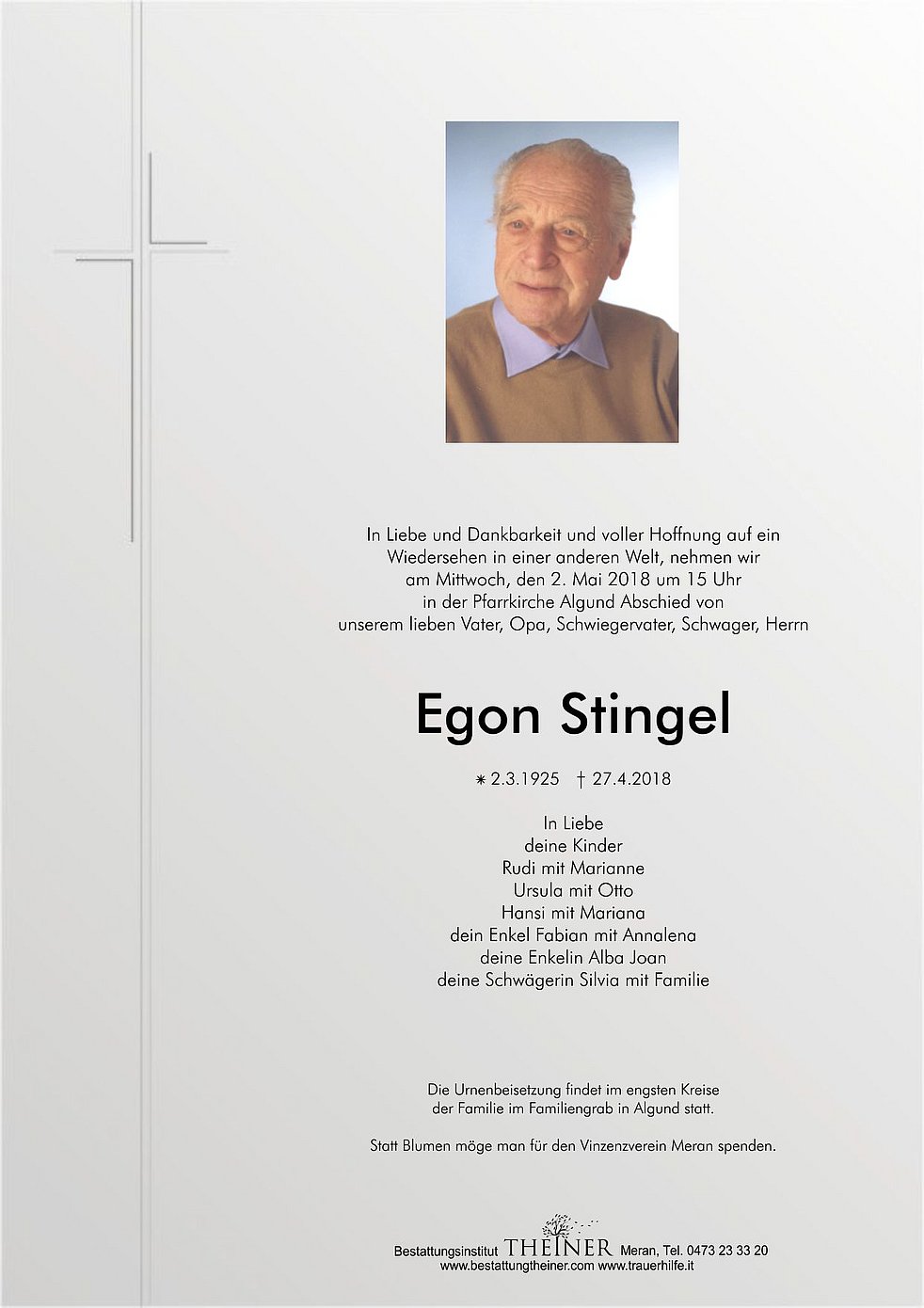 In Liebe und Dankbarkeit und voller Hoffnung auf ein Wiedersehen in einer anderen Welt, nehmen wir am Mittwoch, den 2. Mai 2018 um 15 Uhr in der Pfarrkirche Algund Abschied von unserem lieben Vater, Opa, Schwiegervater, Schwager, Herrn