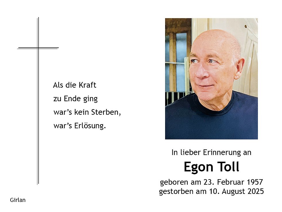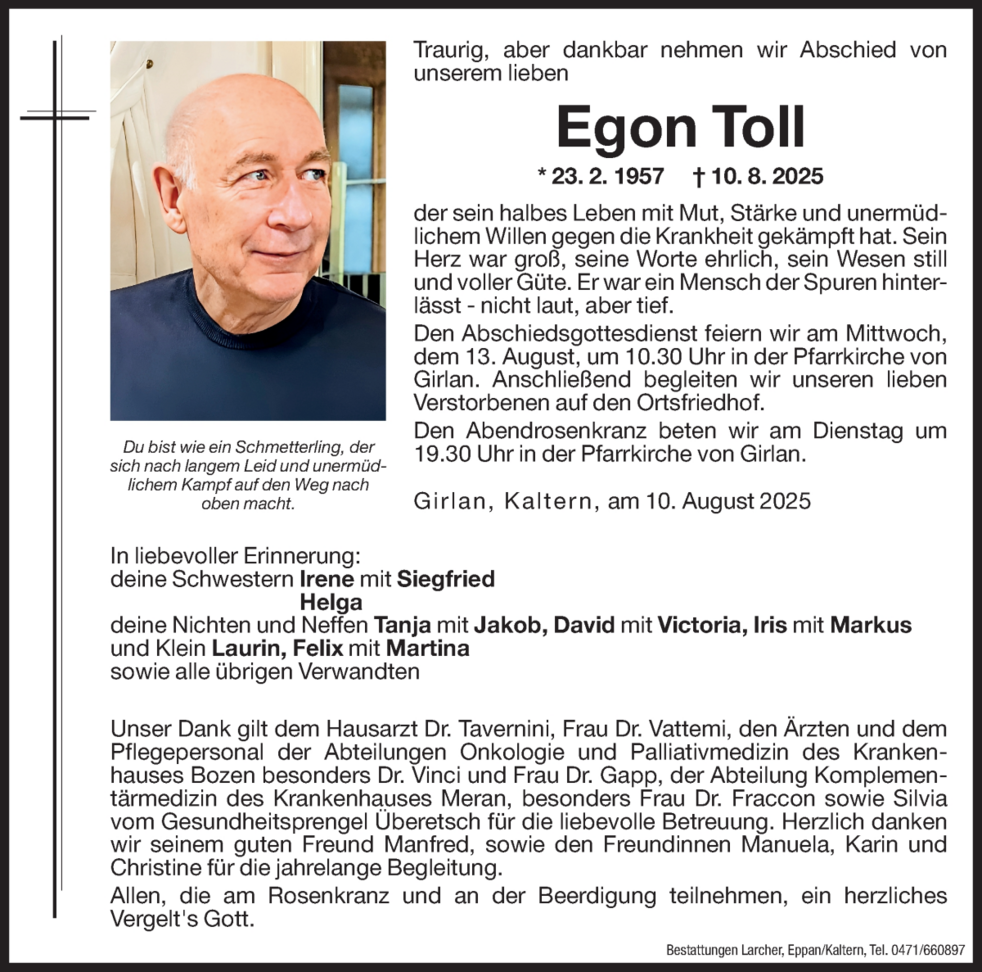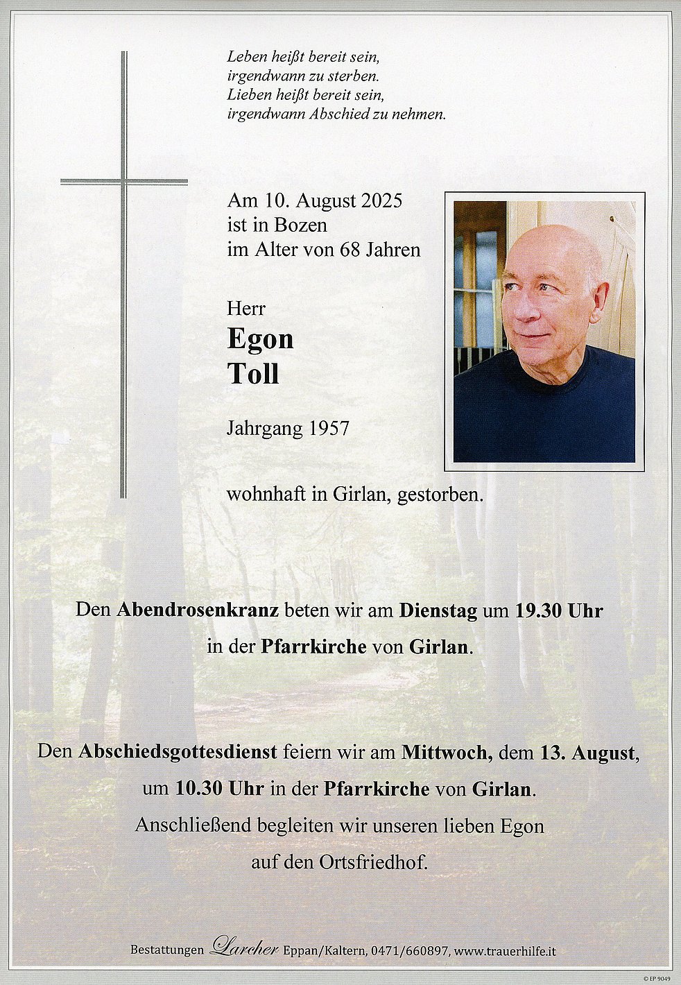 Den Abschiedsgottesdienst feiern wir am Mittwoch, dem 13. August, um 10.30 Uhr in der Pfarrkirche von Girlan. Anschließend begleiten wir unseren lieben Verstorbenen auf den Ortsfriedhof.