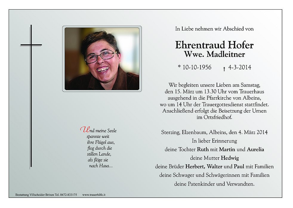 den 15. März um 13.30 Uhr vom Trauerhaus ausgehend in die Pfarrkirche von Albeins,