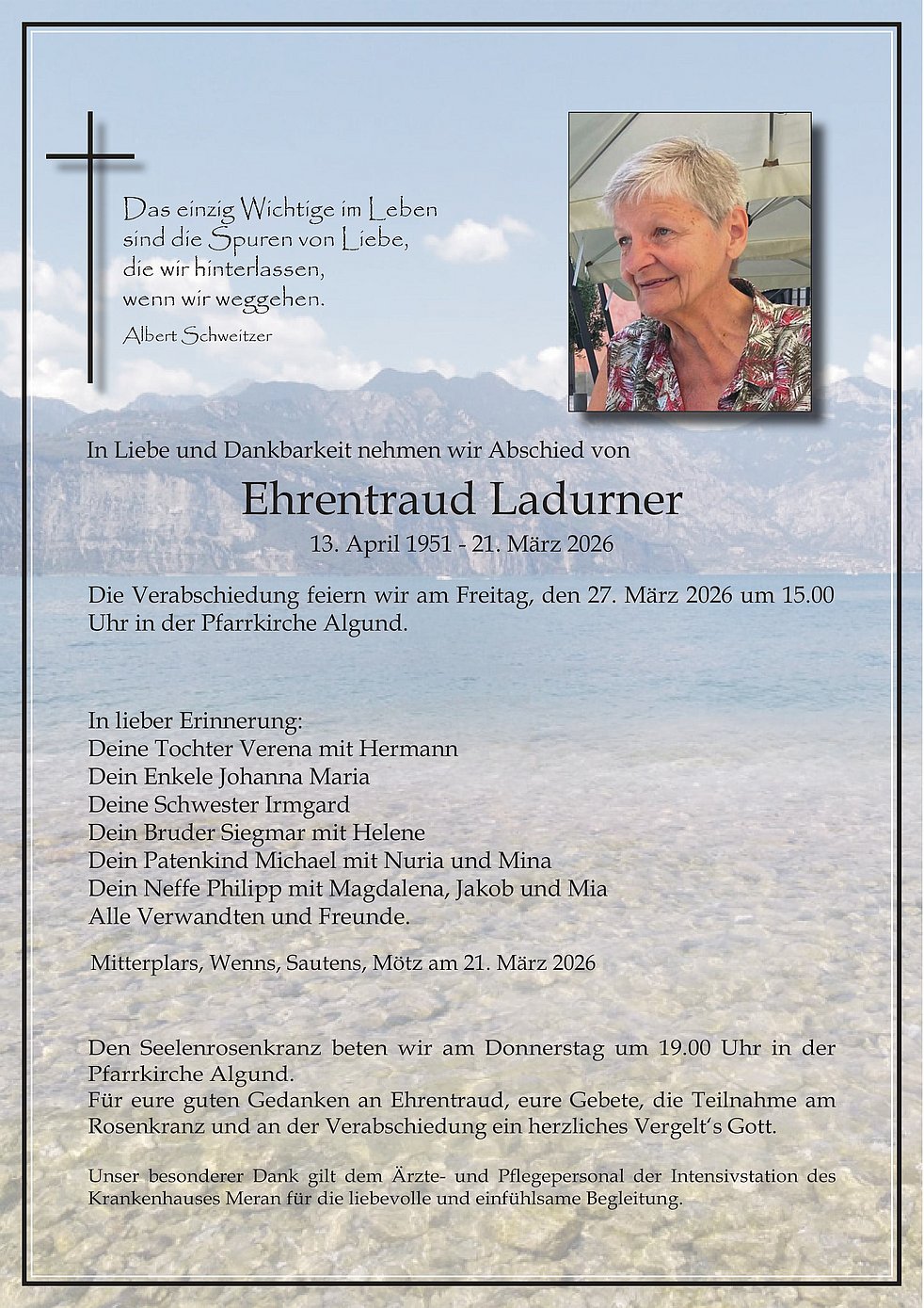 Trauerfeier: 27.03. - 15:00 Uhr Algund
