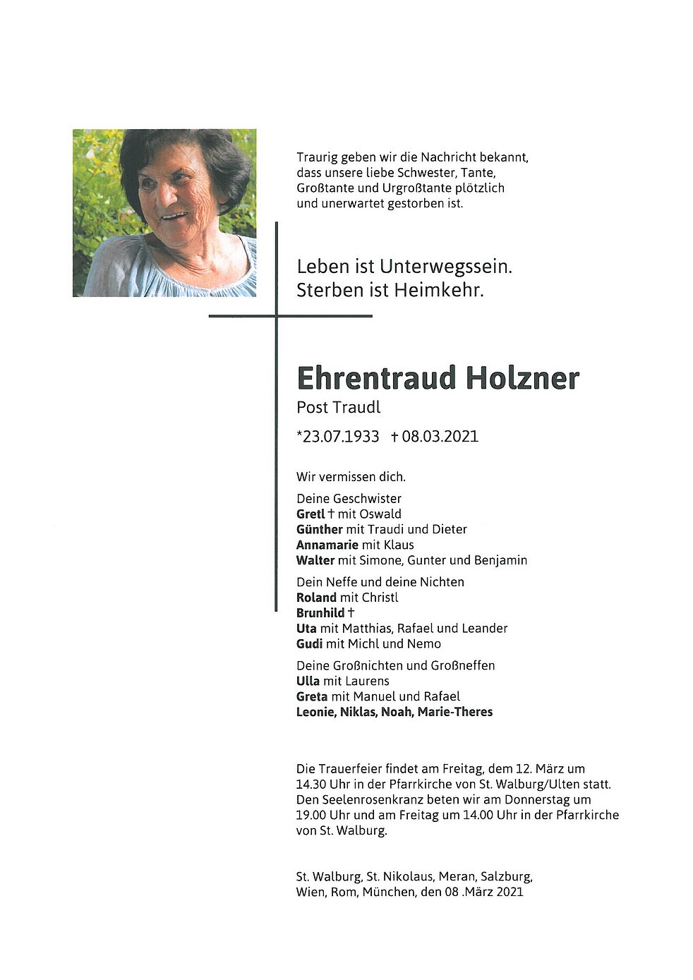 Die Trauerfeier findet am Freitag, dem 12. März um 14.30 Uhr in der Pfarrkirche von St. Walburg/Ulten statt.