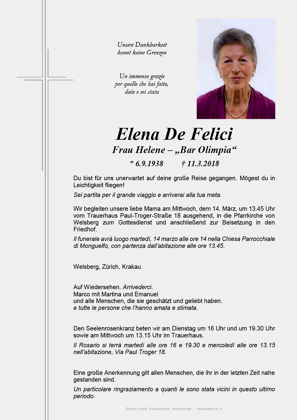 Wir begleiten unsere liebe Mama am Mittwoch, dem 14. März, um 13.45 Uhr vom Trauerhaus Paul-Troger-Straße 18 ausgehend, in die Pfarrkirche von Welsberg zum Gottesdienst und anschließend zur Beisetzung in den Friedhof.