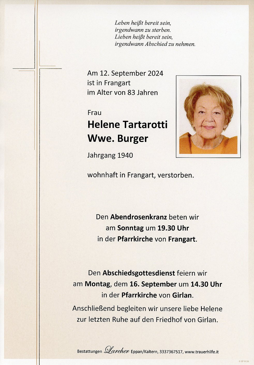 Den Abschiedsgottesdienst feiern wir am Montag, den 16. September, um 14.30 Uhr in der Pfarrkirche von Girlan. Anschließend begleiten wir unsere liebe Helene zum Friedhof von Girlan.