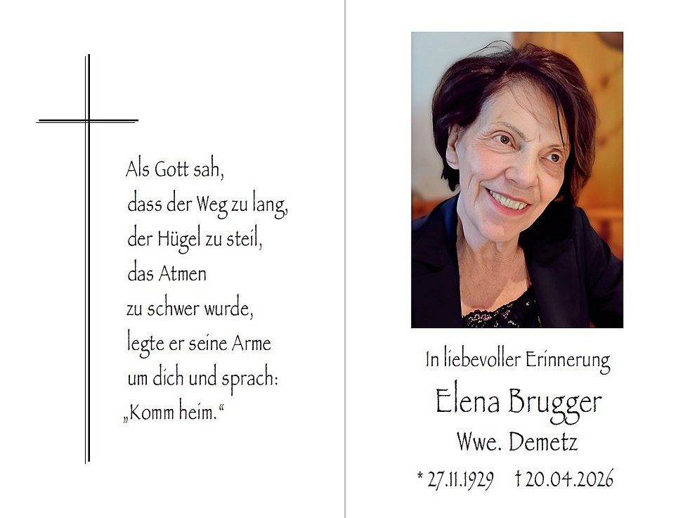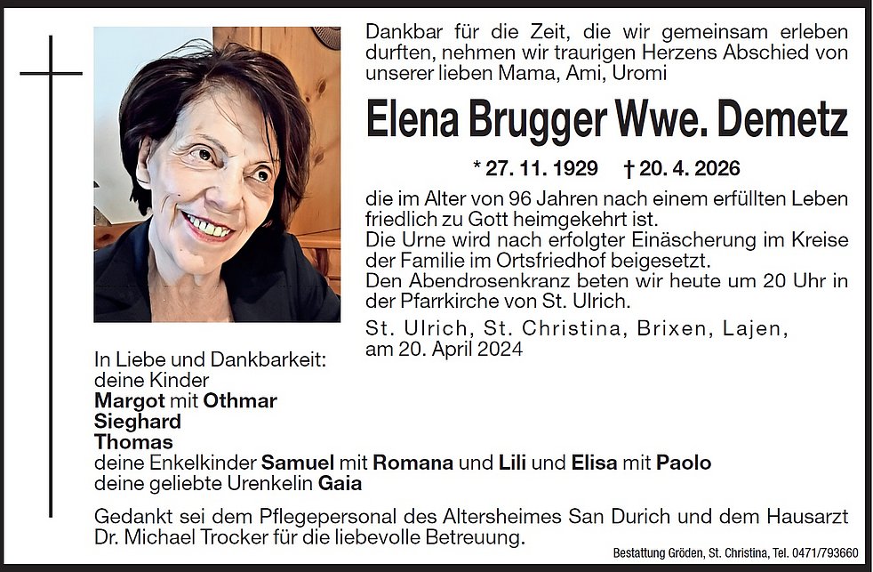 Gedankt sei dem Pflegepersonal des Altersheimes San Durich und dem Hausarzt Dr. Michael Trocker für die liebevolle Betreuung.