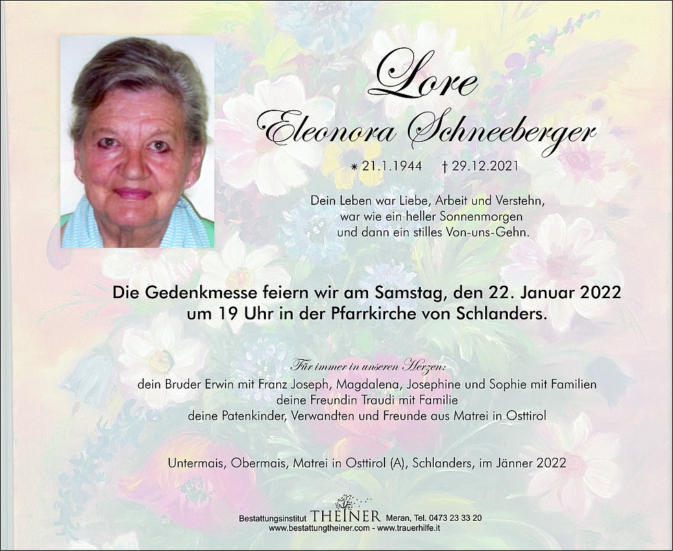 Liebe Lore!Wir weden dich alls liebe und freundliche Nachbarin in guter Erinnerung behalten!Ruhe nun sanft in Gottes Hand.Dir,liebe Traudl und allen Angehörigen drücken wir unser Beileid aus.Deine Nachbarn Seppl und Brigitte Mair Schlanders