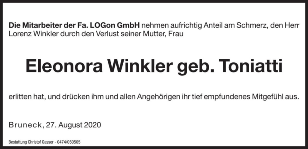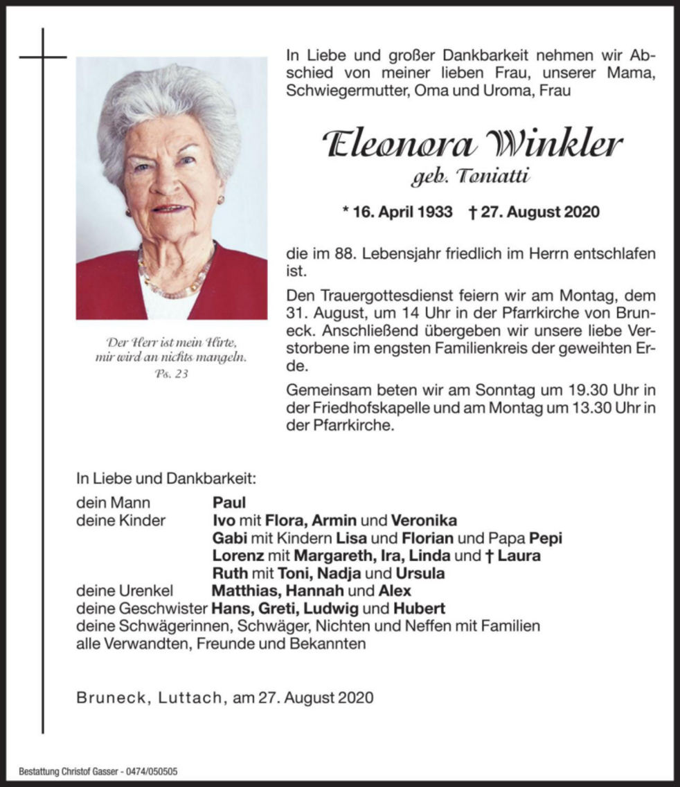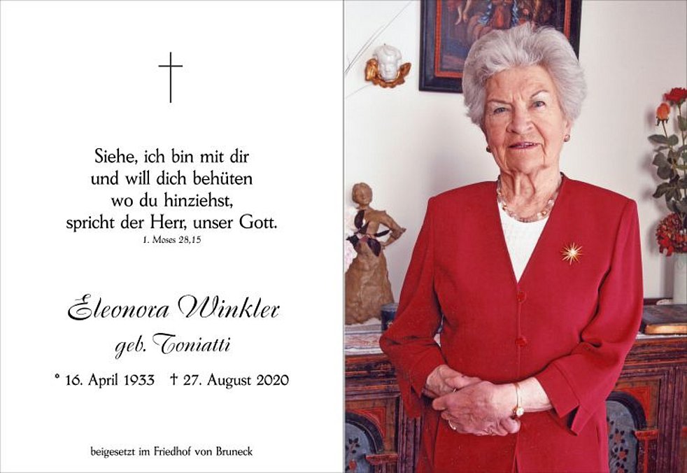 Den Trauergottesdienst feiern wir am Montag, dem 31. August, um 14 Uhr in der Pfarrkirche von Bruneck. Anschließend übergeben wir unsere liebe Verstorbene im engsten Familienkreis der geweihten Erde.