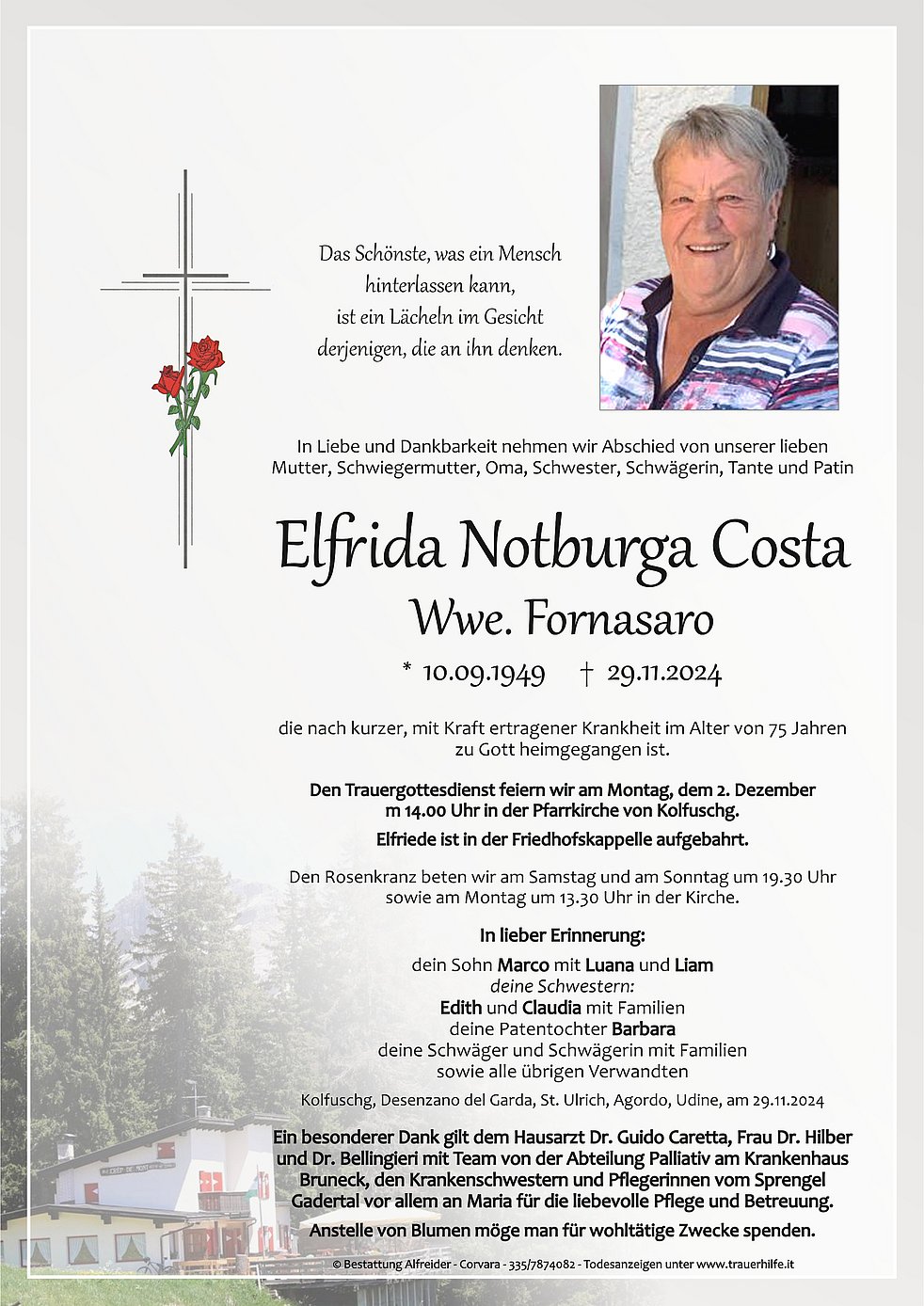 Liebe Elfriede, leider ist unser Wunsch von unserem Treffen nicht zurstande gekommen. Ich wünsche dir eine gute Reise und du bleibst in lieber Erinnerung,als liebe Nachbarin und Freundin in Welsberg. Herzliches Beileid an all deinen Lieben ✨ Pfiati Elfriede ✨