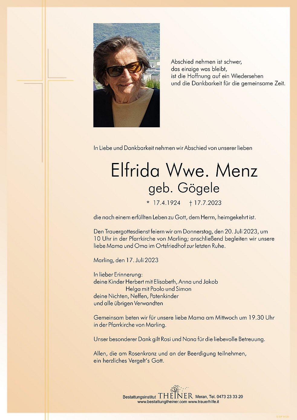 Den Trauergottesdienst feiern wir am Donnerstag, den 20. Juli 2023, um 10 Uhr in der Pfarrkirche von Marling; anschließend begleiten wir unsere liebe Mama und Oma im Ortsfriedhof zur letzten Ruhe.