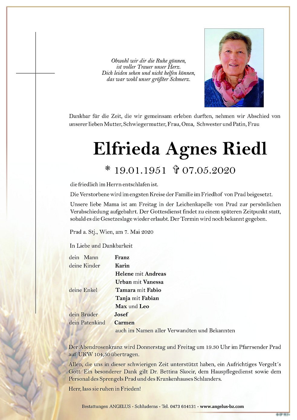 Unsere liebe Mama ist am Freitag in der Leichenkapelle von Prad zur persönlichen Verabschiedung aufgebahrt. Der Gottesdienst findet zu einem späteren Zeitpunkt statt, sobald es die Gesetzeslage wieder erlaubt. Der Termin wird noch bekannt gegeben.